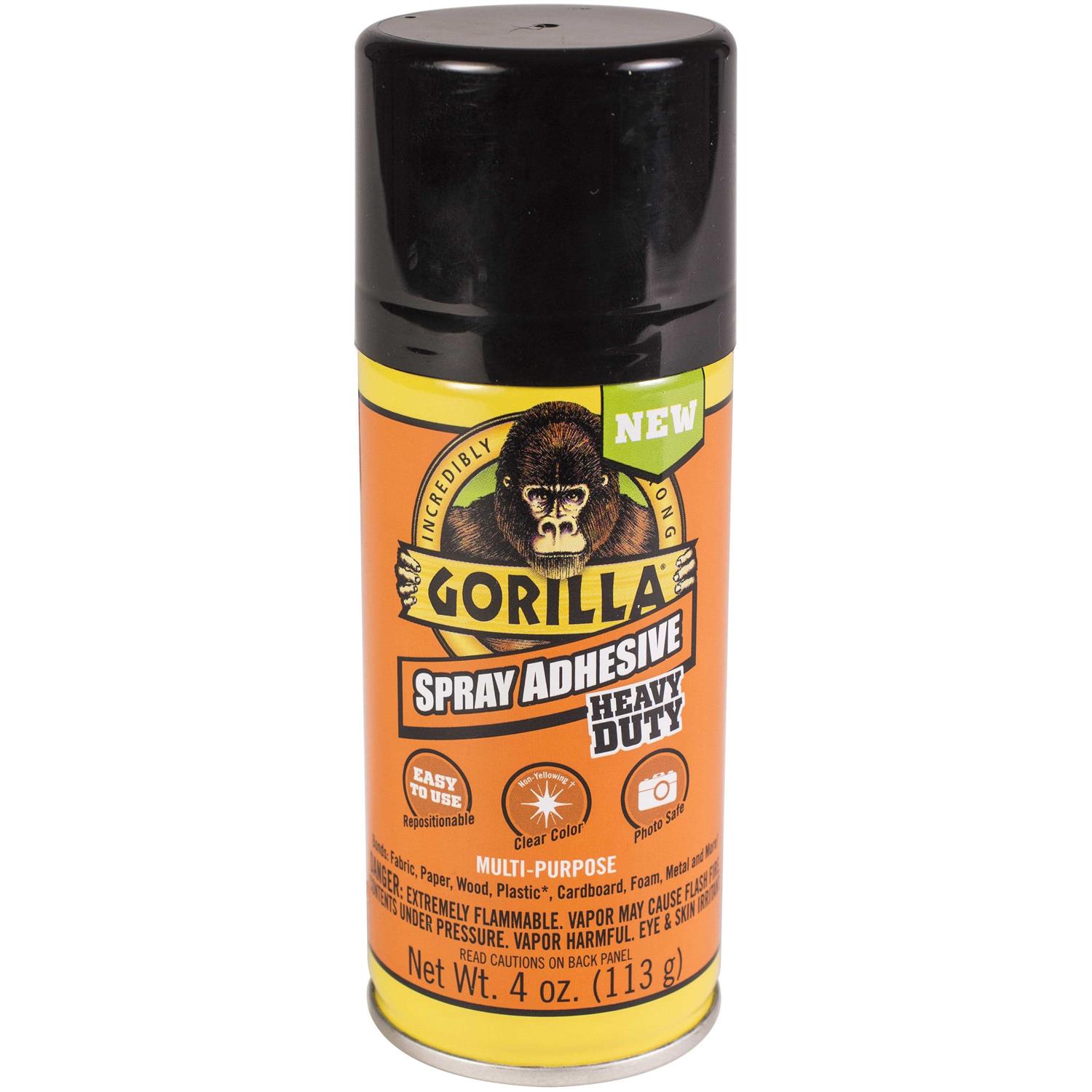 Gorilla Glue Spray Adhesive Heavy Duty 4 oz- Forms a clear, permanent bond that is moisture resistant and can be used both indoors and out. This spray adhesive is also photo safe. Its wide pad nozzle and controlled, fine mist spray provide an even application. Can be repositionable if moved within 10 minutes. Not recommended with vinyl, automotive headliners, polypropylene, polyethylene, or similar materials.