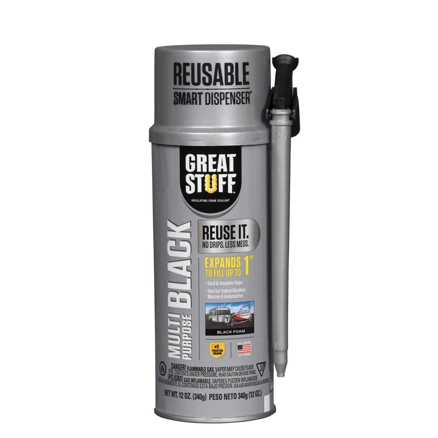 Great Stuff Multipurpose Black Insulating Foam Sealant is a ready to use, minimal expansion polyurethane insulating foam sealant that fills, seals and insulates gaps up to 3/4 in. It expands to take the shape of gaps, creating a long lasting, airtight and water resistant seal. It helps improve energy efficiency by forming an airtight seal in gaps and cracks and is a simple, inexpensive way to minimize unwanted air flow and reduce condensation and can be used in many applications. The black color blends naturally into the surrounding environment and allows cured foam to hide well and not be noticeable in shadows. New Smart Dispenser design eliminates mess and product waste by providing a precise application with no drips. The application is maneuverable and intuitive to use with a simple, trigger gun which saves time. The Smart Dispenser allows the user to reuse Great Stuff for up to 30 days.