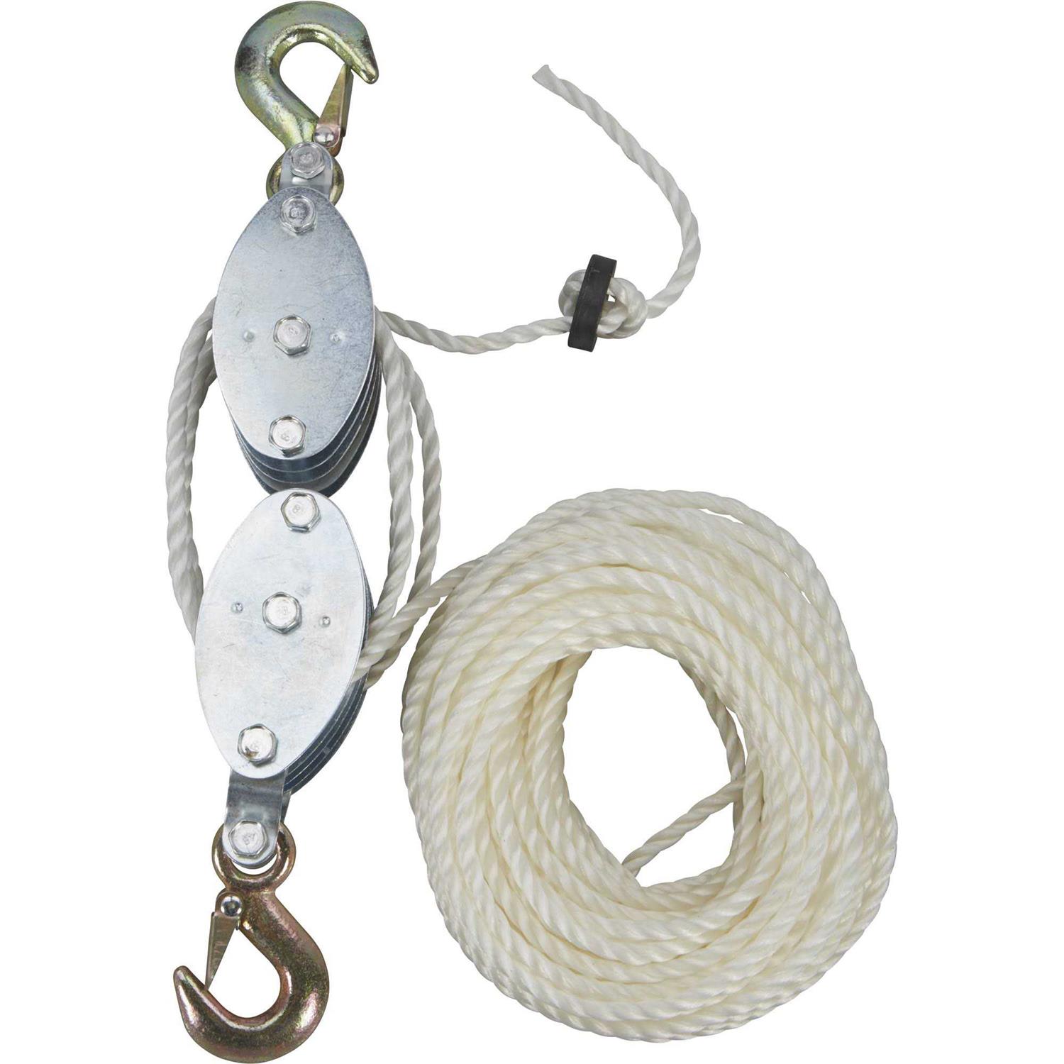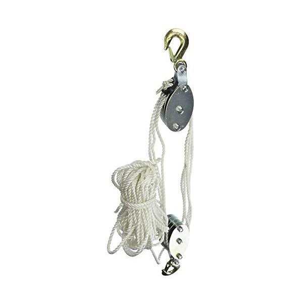 - Rugged 2-1/2″ nylon pulleys with zinc plated hooks and 65 ft of 5/16″; poly rope.