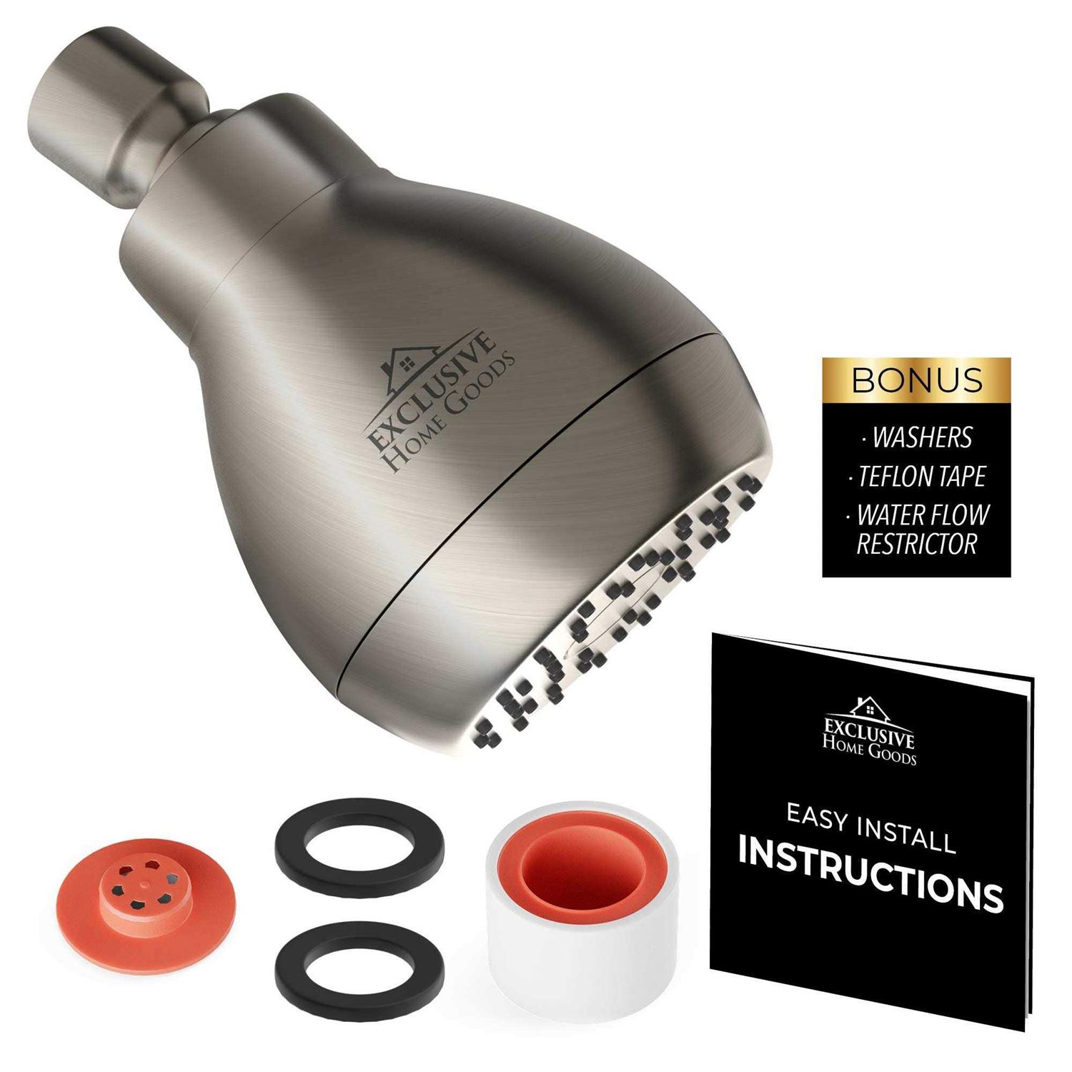 Take a luxurious shower and get refreshed in minutes! You no longer have to dread taking showers as they can now become a quick and soothing experience with our high pressure shower head. Youll be free of all the tension and grime with a fraction of the time, making your morning routine feel like a trip to the spa. Our deluxe showerhead delivers an ultra-powerful blast of water to thoroughly and efficiently cleanse every part of your body. The brass swivel ball joint features a 360 degree rotation that allows you to easily tilt and readjust our bathroom shower head any way you like. Feel energized and refreshed after every shower with Exclusive Home Goods High Pressure Shower Head. Installing our high pressure shower heads is an effortless task with no tools required! It features a universal connection, allowing it to easily fit onto any standard shower arm. Simply take off your old shower head, add a wrap of teflon tape to the shower arm’s threads to ensure a leak proof seal and the water restrictor to limit pressure, then mount the new showerhead. The anti-clog silicone jets in our high pressure shower head ensure that nozzles can be cleaned with ease, resulting in a visually appealing, evenly spread pattern and robust pressure. Moreover, the silicone prevents any lime deposits and hard water accumulation from forming. Made from durable brushed nickel plated ABS, our shower head is rustproof with an adjustable overhead bracket. This high pressure shower head features a solid brass adjustable swivel ball joint that provides superior resistance to moisture damage and cracking. Step into a powerful blast of invigorating and refreshing water with Exclusive Home Goods High Pressure Shower Head. Add this to your cart today.