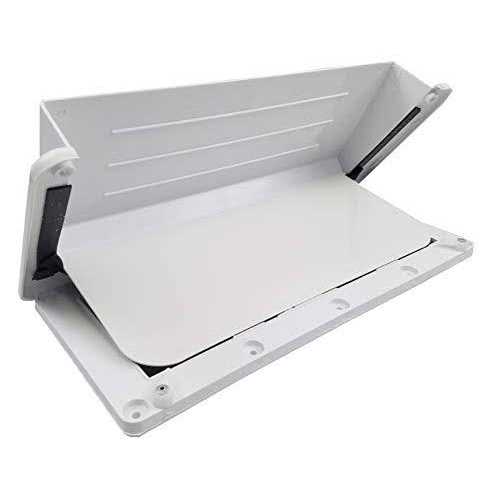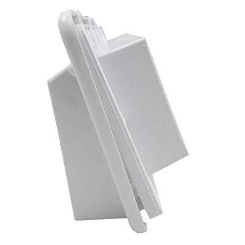 Outside exhaust cover with damper (4″ x 10.88″). White. UV and weather resistant. Easy to install. Mounting hardware not included. Consists of an attractive exterior vent cover designed to keep rain and dust out of your vehicle with an outside manual release damper. Once the outside manual release damper is unsecured, the damper automatically opens when the range hood fan is activated to allow cooking odors and smoke to be exhausted. The damper automatically closes to prohibit insects and dust from entering when the range hood is not in operation. The manual release damper must be secured before traveling.