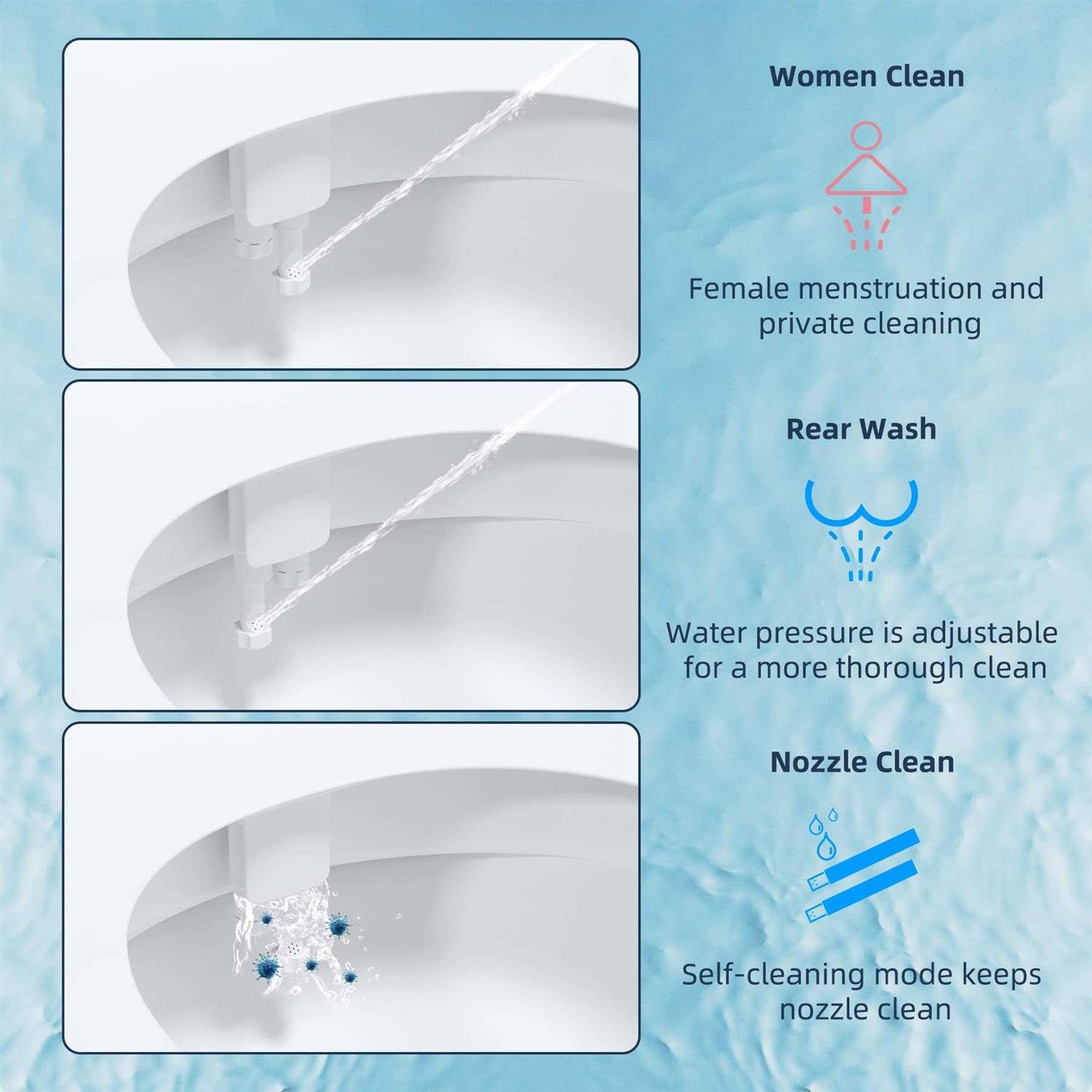 Hibbent toilet seat attachment turn your ordinary toilet into a luxurious bidet in just minutes. The bidet is thoughtfully designed with advanced technology that to provide the best, most comfortable bathroom experience. Product features: 1. With the smooth control dial, you can relax on the toilet seat and fully control your bidet including water temperature and pressure. 2. Providing both cold and hot water cleaning which is more comfortable than traditional toilet paper. 3. The toilet seat bidet is designed for your comfort and convenience. 4. Requires no special tools to install. 5. Dual nozzles providing Your Rear or Female Region Washing, Sanitizing.