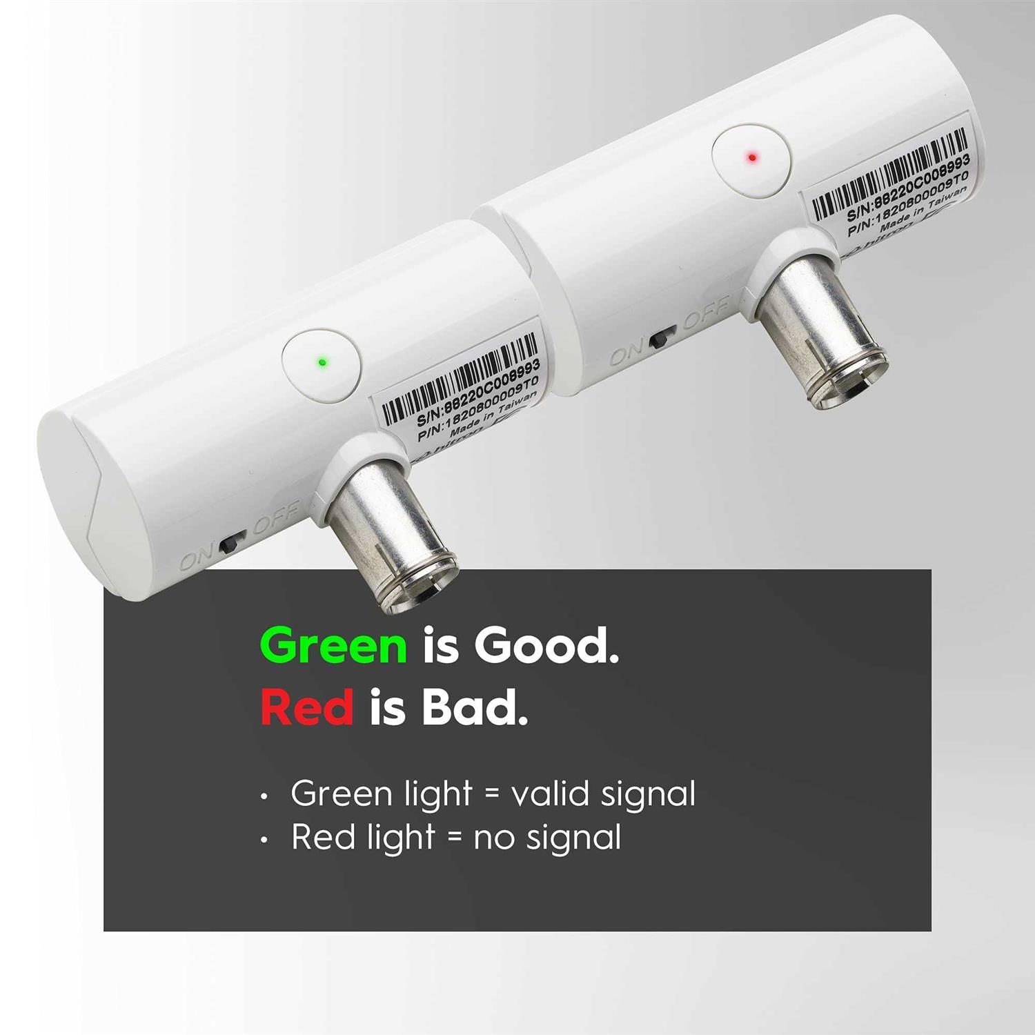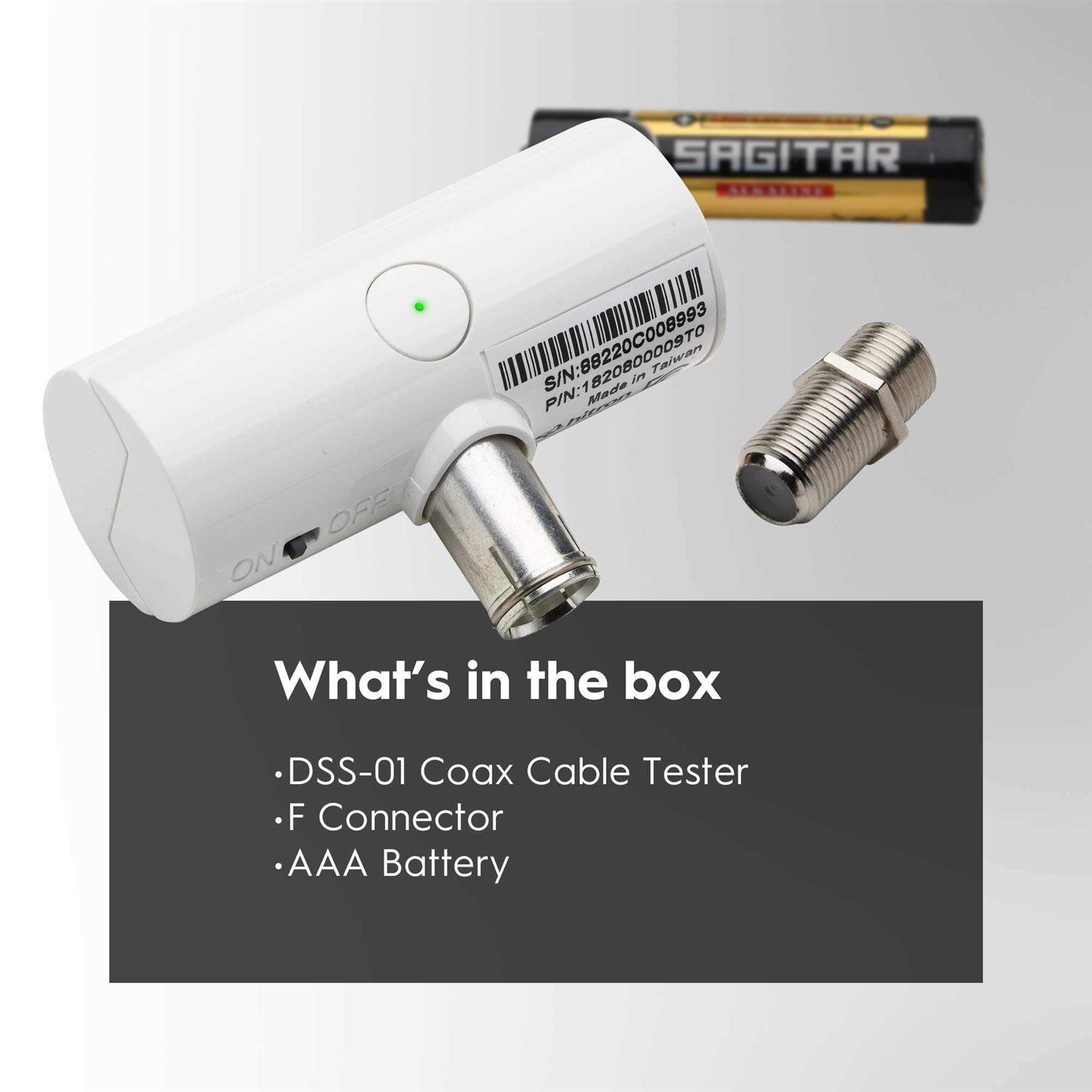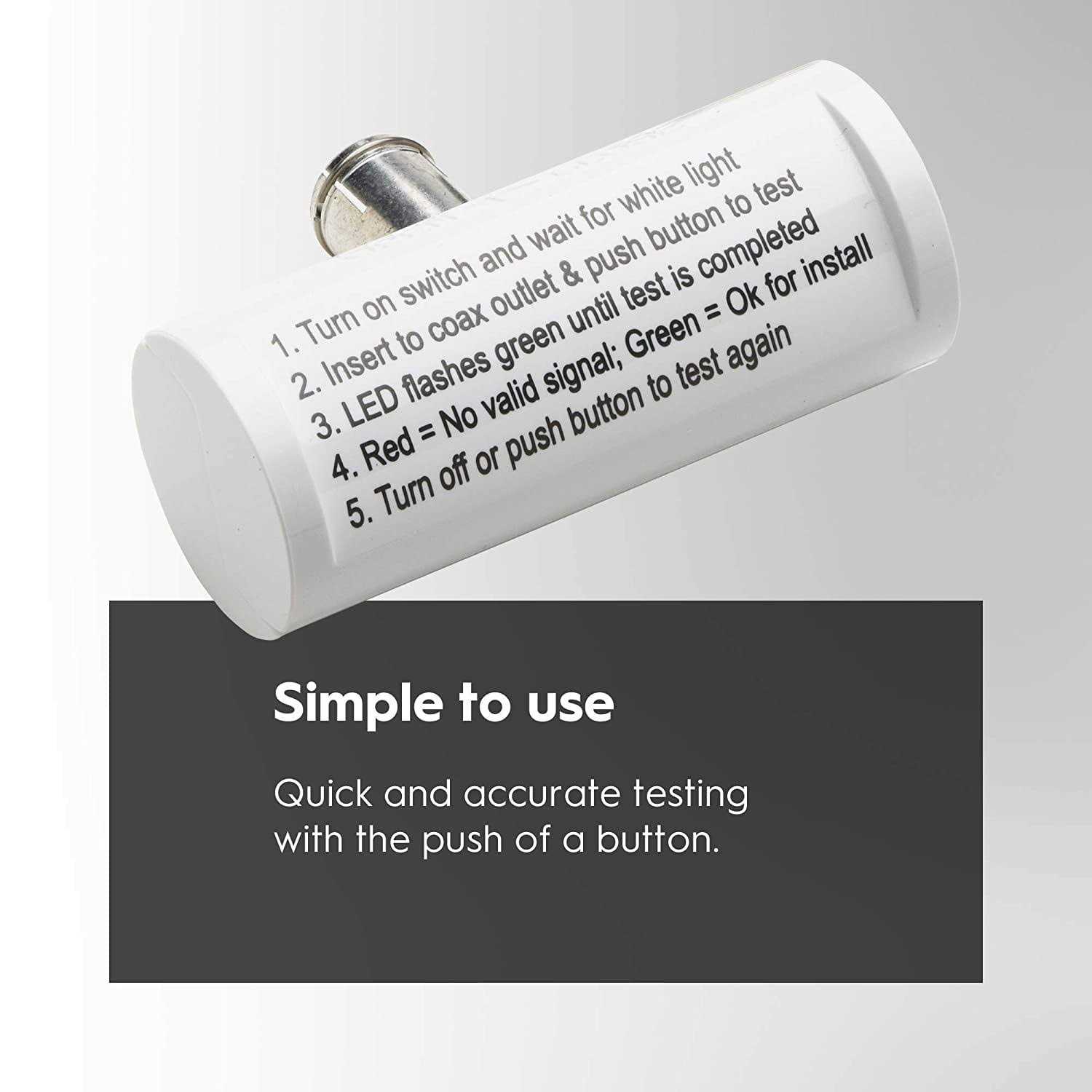 EASY COAX SIGNAL TESTER simplifies your cable modem setup by instantly detecting valid signals from your Cable Broadband provider right at your coax outlet or wiring. Eliminate the guessing game when connecting your cable modem! Does NOT detect Satellite or FiOS signals. INSTANT ACCURATE DETECTION checks if valid cable operator signals are present between 88MHz and 1GHz frequency range. Eliminates false-positives from stripped wiring acting as an antenna, hidden splitters or nearby UHF/VHF stations. Save time and frustration! SIMPLE PUSH BUTTON OPERATION provides instant, accurate testing results for valid signals from your Cable Broadband provider. A perfect low-cost solution for homeowners, renters, contractor cable installers and field technicians. SIMPLE PLUG & TEST with easy to read LED indicates GREEN for signal and RED for no signal. Instantly know which coax outlet or wire to connect your cable modem or router to. Built-in voltage protection up to 4K volts. Patent-pending technology. AAA BATTERY INCLUDED so you can start using it right out of the box. Performs up to 100 scans on a single battery. Durable construction and compact design to fit in tight areas. One-hand testing so you aren’t fumbling with additional tools. EASY COAX CABLE TESTER instantly detects valid signals from your Cable Broadband provider right at your coax outlet or coax wiring. Accurate testing of valid cable operator signals between a specific frequency range so you avoid false-positive test results caused by hidden splitters or wiring anomalies. Simple one-push button operation, low-cost solution perfect for home owners, renters, contractors or cable technicians. Performs up to 100 scans on a single AAA battery that comes included at purchase. Compact size to fit into small spaces with durable construction. Start using it right out of the box to simplify you cable modem setup.