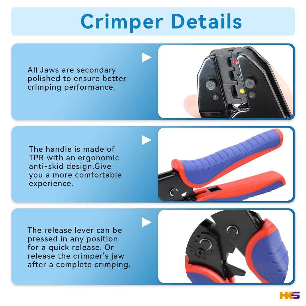 HKS Ratcheting Crimping Tool Set 8 Pcs – Quick Exchange Jaw for Heat Shrink terminals, Non-Insulated, Open Barrel, MC4 connce