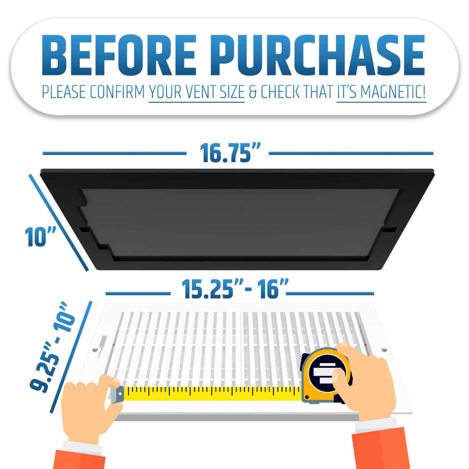 Please use our size chart to choose the correct magnetic cover that will fit both your specific vent dimensions and color. Once installed, this cover will never move, shift or fall off of your vent. ️ COMPLETELY BLOCKS COLD/HOT AIRFLOW IN SPECIFIC ROOMS/AREAS – At last, a magnetic vent cover that actually works! It completely prevents hot or cold airflow in specific rooms. No more freezing rooms with really cold air blowing at you while sleeping and no more hot rooms that feel like a sauna. In addition, it will also help with annoying noises (like loud music) or unwanted smells (like smoking or cooking) from neighbors in apartment buildings. ️ ️ IT IS SUPER EASY TO INSTALL & WILL BOOST THE AIRFLOW IN OTHER ROOMS – Once the magnetic vent covers are installed in unoccupied rooms (like basements), the airflow in other rooms will significantly increase. This is a simple and cost-effective solution that takes minutes. Simply follow our step-by-step included instructions and use the sturdy box to store covers that are not currently in use. The magnetic covers will work on any vent that matches the cover size ranges. Each cover is designed with a different backside pocket feature and specific locations of hidden magnets. First, check that your vent is magnetic. Second, this cover WILL ONLY work on vents with a width between the range of 9.25” to 10” and length between the range of 15.25” to 16”.