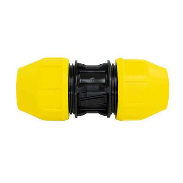 Pipe Coupler allows you to safely and easily connect two pieces of polyethylene gas piping. Simply cut the pipe slide in the provided stiffener and slide into the fitting and tighten down. Color: Yellow.