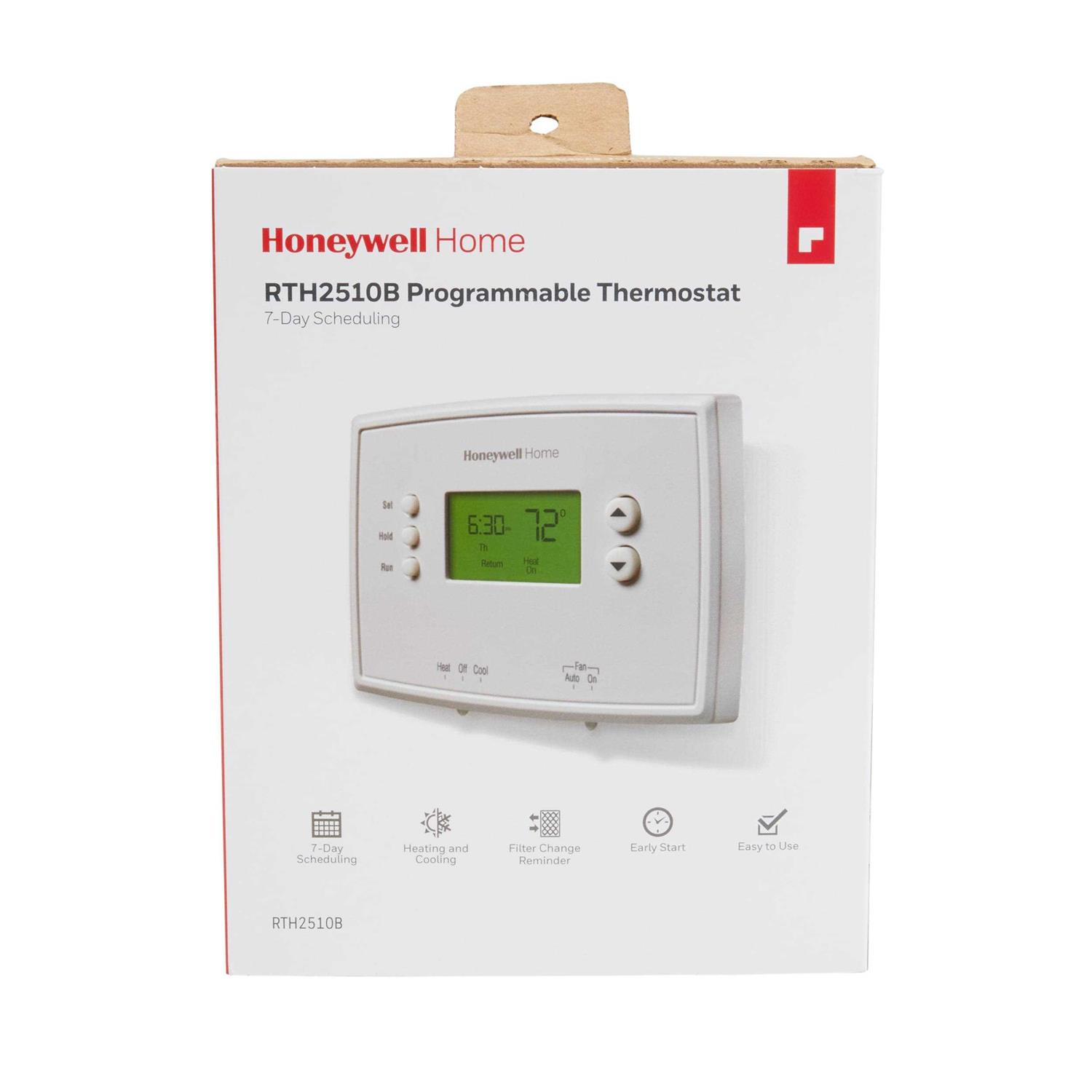 This Honeywell programmable thermostat can be programmed up to 4 periods per day for 7 days. This will help you cut 33% off of your energy bill. It features precision temperature control, easy to read backlit display (in Farenheit and Celsius) and compatible with heating/cooling/heat pump systems. Package includes mounting hardware and quick install guide. It requires 2 AAA batteries (not included). Precision temperature control Easy to read backlit display (in Farenheit and Celsius) Works day and night, weekday and weekend User-friendly, extra large display Keep your house at just the right temperature Filter Change Reminder Keep your heating/cooling system operating at peak performance. Basic operation keeps programming easy.