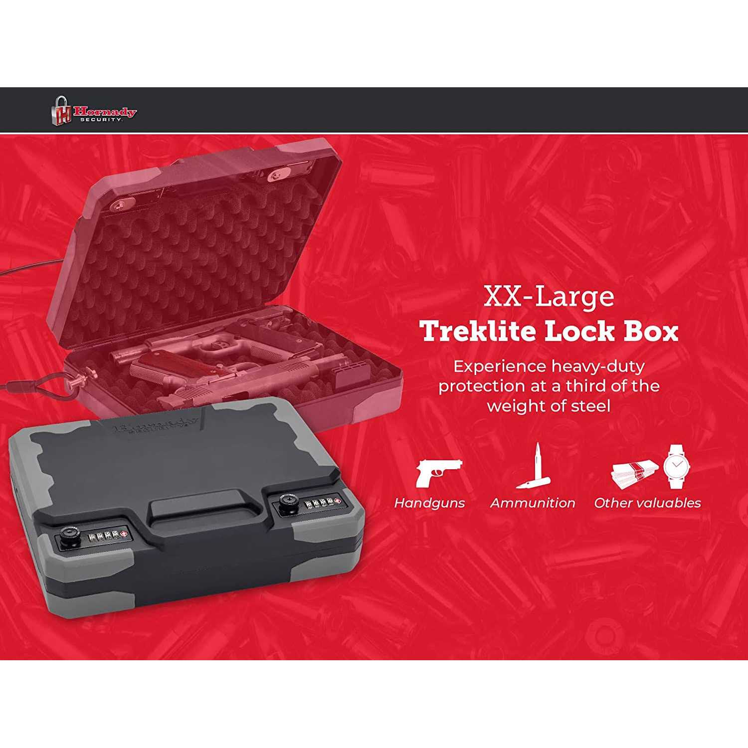 The Hornady TrekLite Lock Box lives up to its name with groundbreaking security technology to protect your handguns and other valuables TSA lock offers advanced security and 10,000 user programmable codes. Protects firearms, ammo, and other valuables while traveling or at home. Constructed of advanced, impact-resistant Fits up to two full-sized 1911 handguns. Durable, non-slip rubber over mold provides added impact protection and stability. Includes 1500 lb. rated security cable with patented cable connector that maximizes cargo space Dual 4-Digit TSA lock offers advanced security and 10,000 user programmable codes. Protects firearms, ammo, and other valuables while traveling or at home. Constructed of advanced, impact-resistant polycarbonate for exceptional toughness. Fits up to two full-sized 1911 handguns. Durable, non-slip rubber over mold provides added impact protection and stability. Includes 1500 lb. rated security cable with patented cable connector that maximizes cargo space. Sized to fit 8.5 x 11 documents.