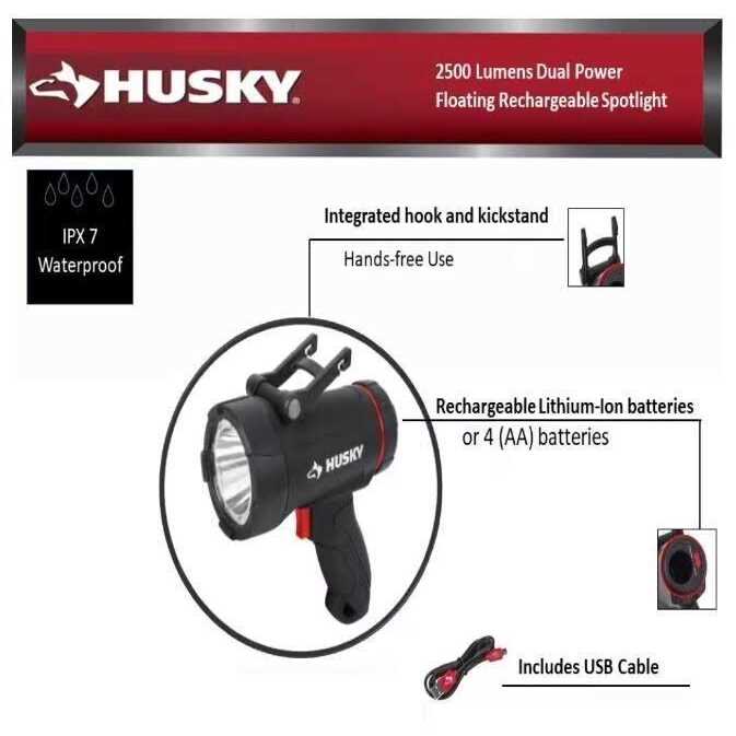 Description:This Husky 2500-Lumens Hybrid Power Floating Rechargeable Spotlight features a compact size spotlight with super bright LED lights. High mode provides up to 2500-Lumens, 550 m throw. The 6-mode capacity provides light options for all your different projects. Modes include: high light, medium light, low light, ECO, red light, and red flashing. High, medium, and low modes provide the right amount of light for your projects, while the red helps with night vision. IPX7 waterproof and floating construction withstands the most extreme weather conditions. This spotlight will automatically flash red when in water. Features include a built-in integrated hook and kickstand for hands-free Use. Can be powered by either Rechargeable Lithium-Ion Rechargeable Battery or (4) AA Batteries in case of emergency (4 AA Battery not included).