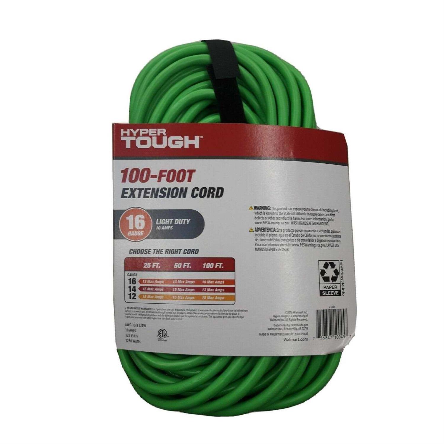 The Hyper Tough 100-foot 16/3 Green Extension Cord is ideal for use in dark environments whether inside your garage or when you need to work outdoors. This extension cord features a highly visible green color that is easily recognizable while in use. This visibility feature will enhance your safety by avoiding possible tripping over the cord or running over with your outdoor tools. This cord comes with an adequate length for flexible and versatile use whenever you need to power them from a certain distance in order to get the job done.