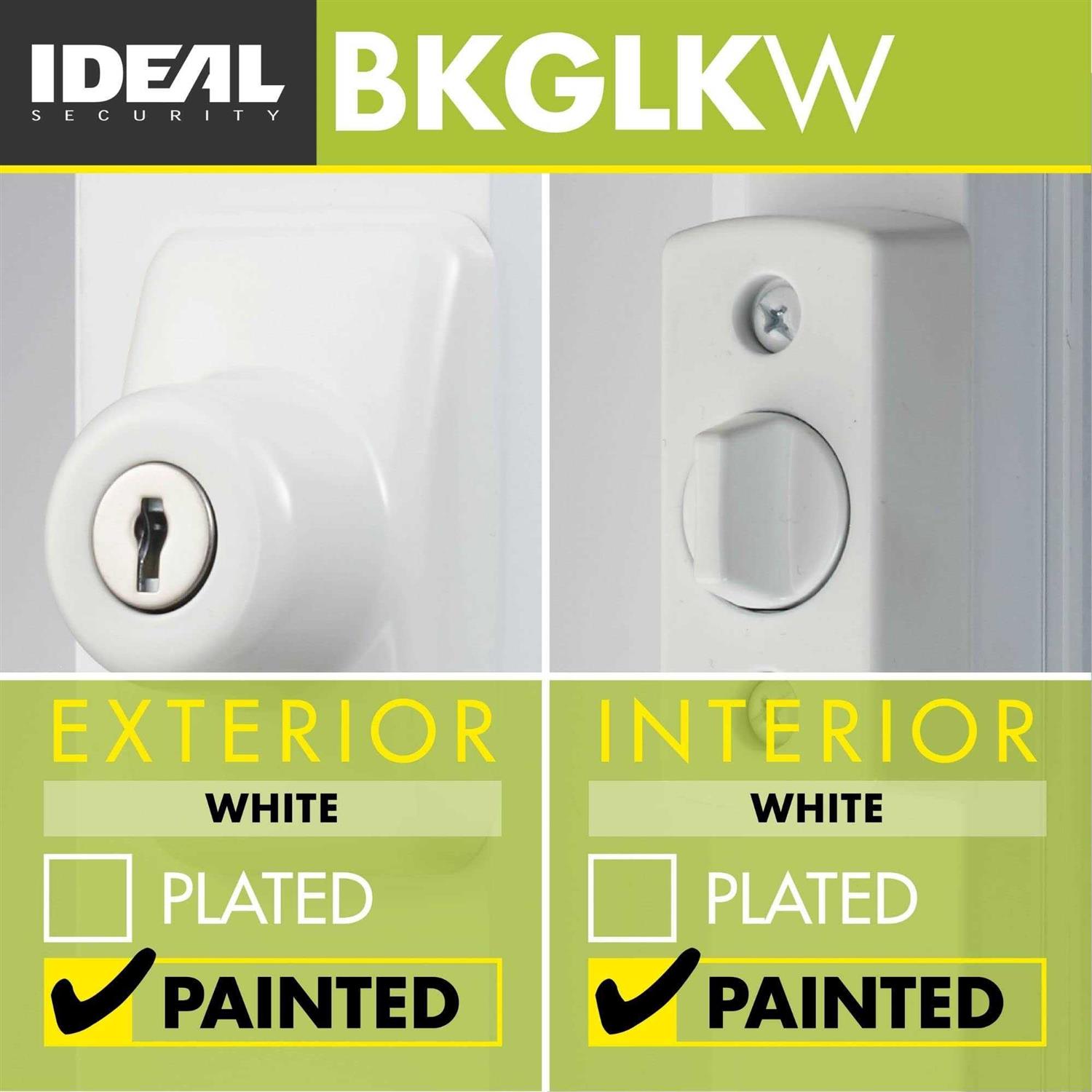 FUNCTIONALITYA keyed deadbolt allows you keep your main door open and enjoy the light that comes in through a storm door while still feeling secure. The SKGLK is not a high security lock, but a secondary level of security. The key allows you to lock your storm door as you leave the home and unlock it if someone inside has locked the door. Installation is easy and should take about 20-minutes. Only 3 small 5/16 in. holes are required to be drilled through the door for the screws and spindle (many of our competitors’ locks require larger 7/8 in. holes). Only a tape measure, drill and screw driver are required. A center punch to mark the holes is handy, but not required. The set includes screws for doors 1 in. to 2-1/8 in. thick. The spindle can be cut to the length required. The SKLGK is designed for out-swinging storm doors. More If you have a DX Series pull or push-button handle, you may want to consider the DX Series deadbolt (model # SK703). The set is manufactured from die cast zinc and painted or coated to match the color of the handles. IDEAL SECURITY has been supplying quality storm and screen door hardware to door manufacturers for over 50-years. Color: White.