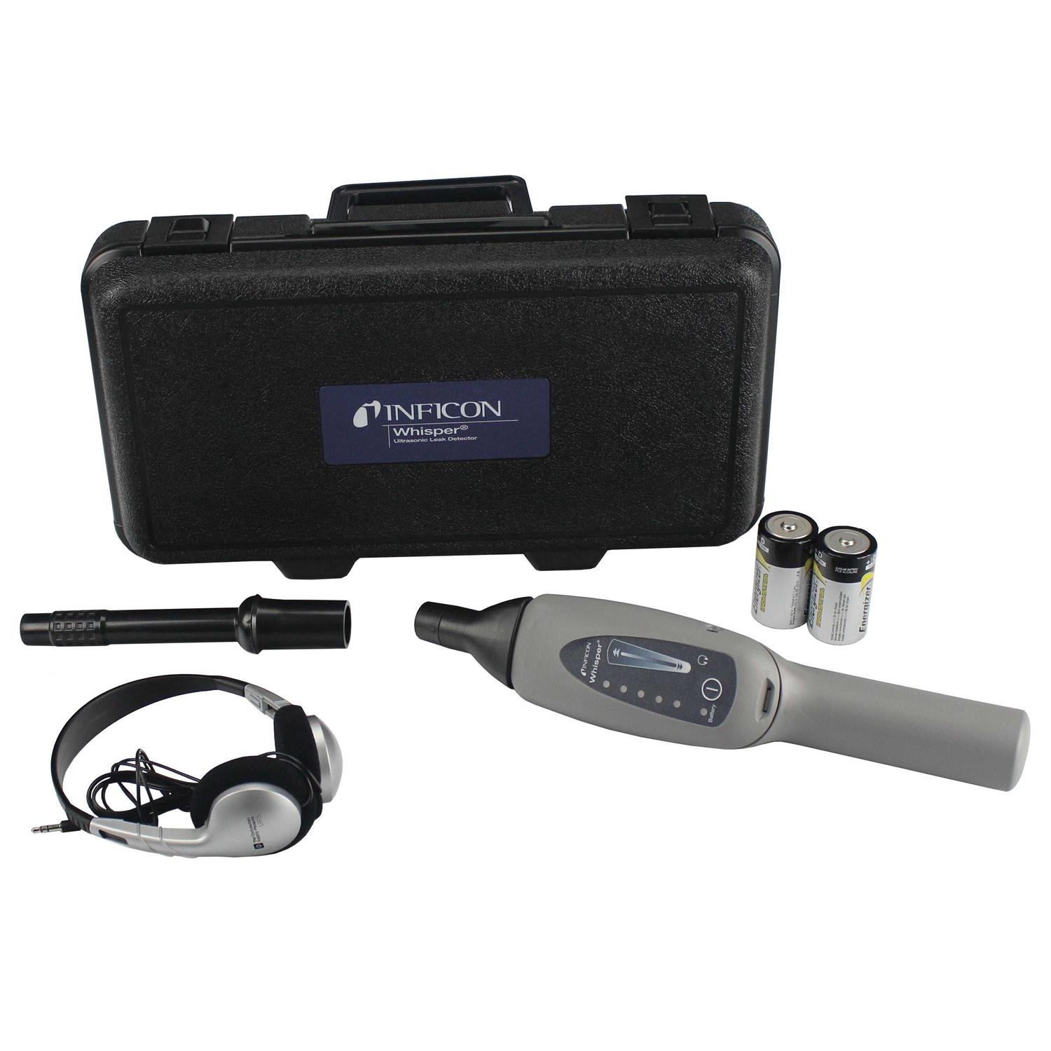 Inficon Whisper Ultrasonic Leak Detector 711-202-G1 Detects Refrigerant and Nitrogen leaks The leak detector includes a specialized built-in receiver that detects frequencies in the 40.5 kHz range. Through sophisticated circuitry Whisper locates the ultrasound’s source while an internal noise control ensures the instrument is unaffected by audible noise. This makes Whisper a versatile tool which can even be used in noisy environments such as mechanical rooms. Detects leaks of any gas under pressure or vacuum.