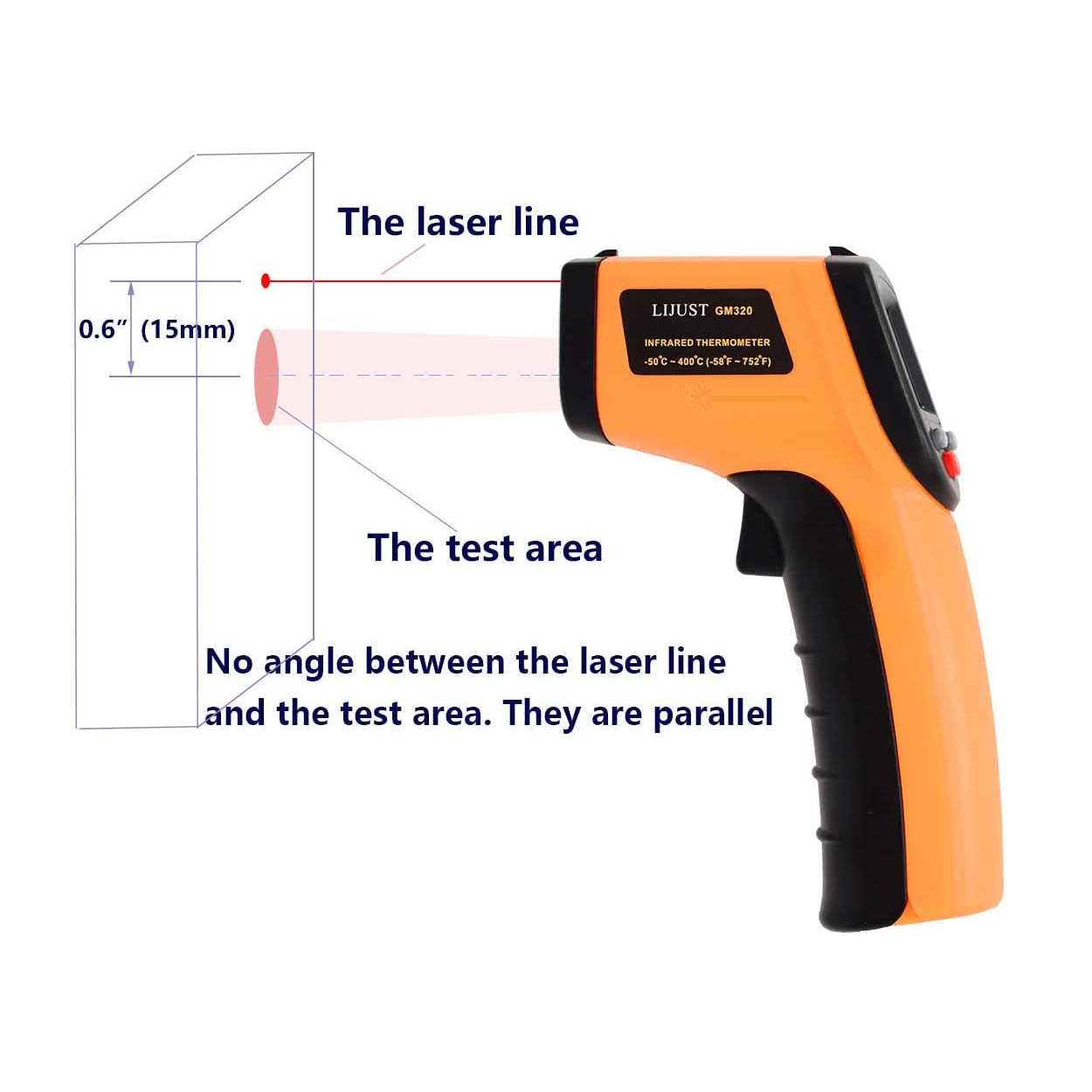 LIJUST Infrared Thermometer Temperature Gun, Digital Thermometer Non-Contact Laser Infrared Ir Thermometer Gun(Not for Human) -58°F~752°F(-50°C~400°C) – Kitchen Cooking Gun, Freezer Oven Thermometer Infrared Thermometer instrument Laser Thermometer Gun(Not for Human) -58°F~752°F(-50°C~400°C) – Temperature Probe for Cooking/Air/Refrigerator/Freezer,kitchen thermometer gun cooking, infrared thermometer cooking, commercial thermometer Product Features [HIGH ACCURACY]: Combining the latest temperature sensor technology and advanced Fresnel lens, this instrument reads values of high accuracy up to 1.5C/1.5% in only 0.5s. The Distance to Spot Ratio is 12:1, meaning this device can accurately measure targets at greater distances compared to most other infered Thermometers. [VERSTILE DESIGN]: With wide temperature range -50C~400C(-58F~752F), you can apply this tool in cooking, barbecuing, auto maintenance, home repair, or other tasks of household. (But not suitable for measure human body temperature) [Applications]Used to measure the surface temperature of objects while cooking, baking, grilling, frozen food, fried food, car repair, home maintenance, plantation, winemaking, water temperature measurement, appliances, adapter temperature measurement, etc.! The thermometer is only used for industrial and domestic kitchen, auto / electrical maintenance. [AUTO-SHUT OFF FEATURE]The LCD screen is backlit, also has an Auto-Off function to extend the battery life, and features a low battery indicator so you never accidentally run out of juice (battery not included). [WARNING TIPS FROM HOLDPEAK]Temperature readings from this laser infrared thermometer are inanimate objects. The accuracy of measured temperature for humans or animals would be lower.