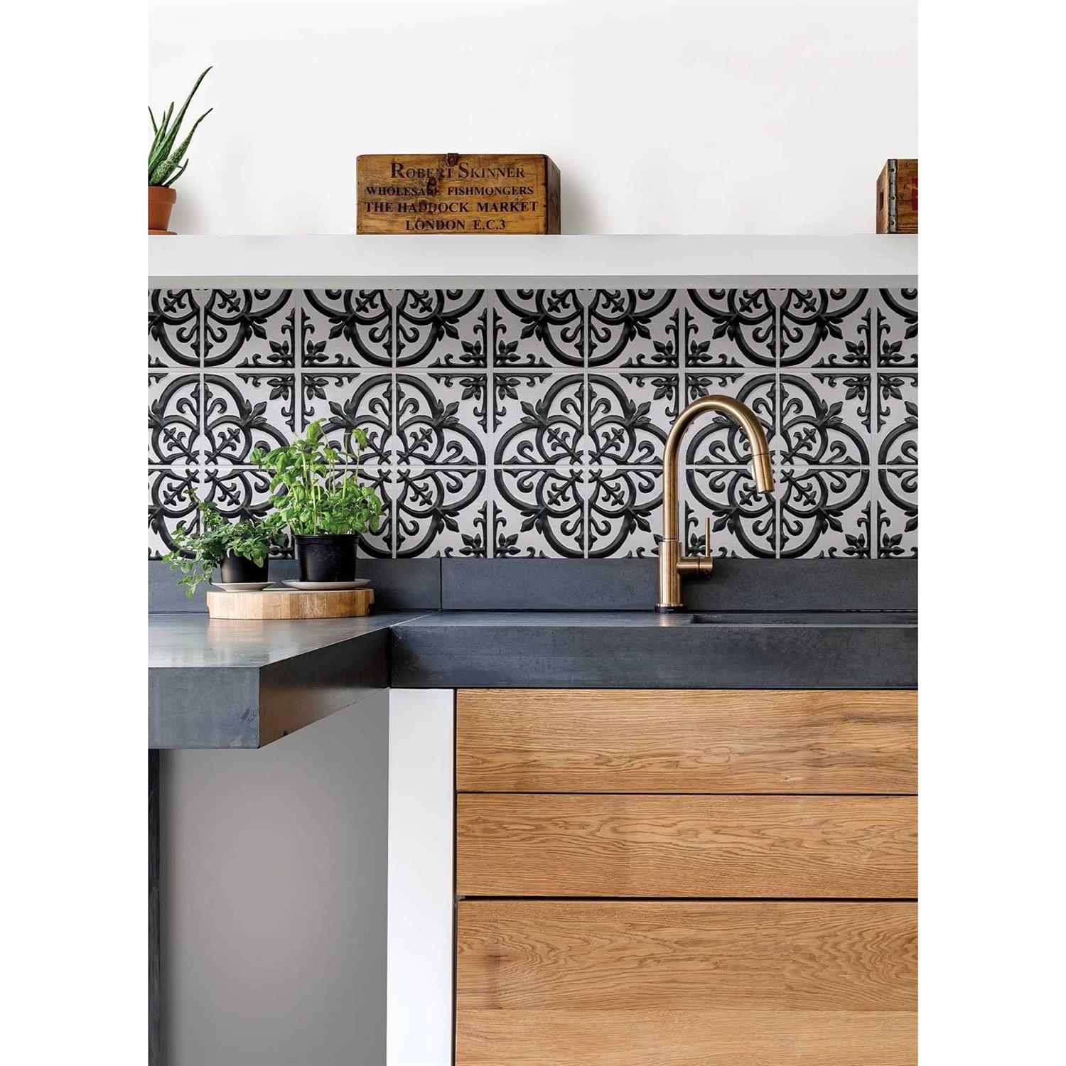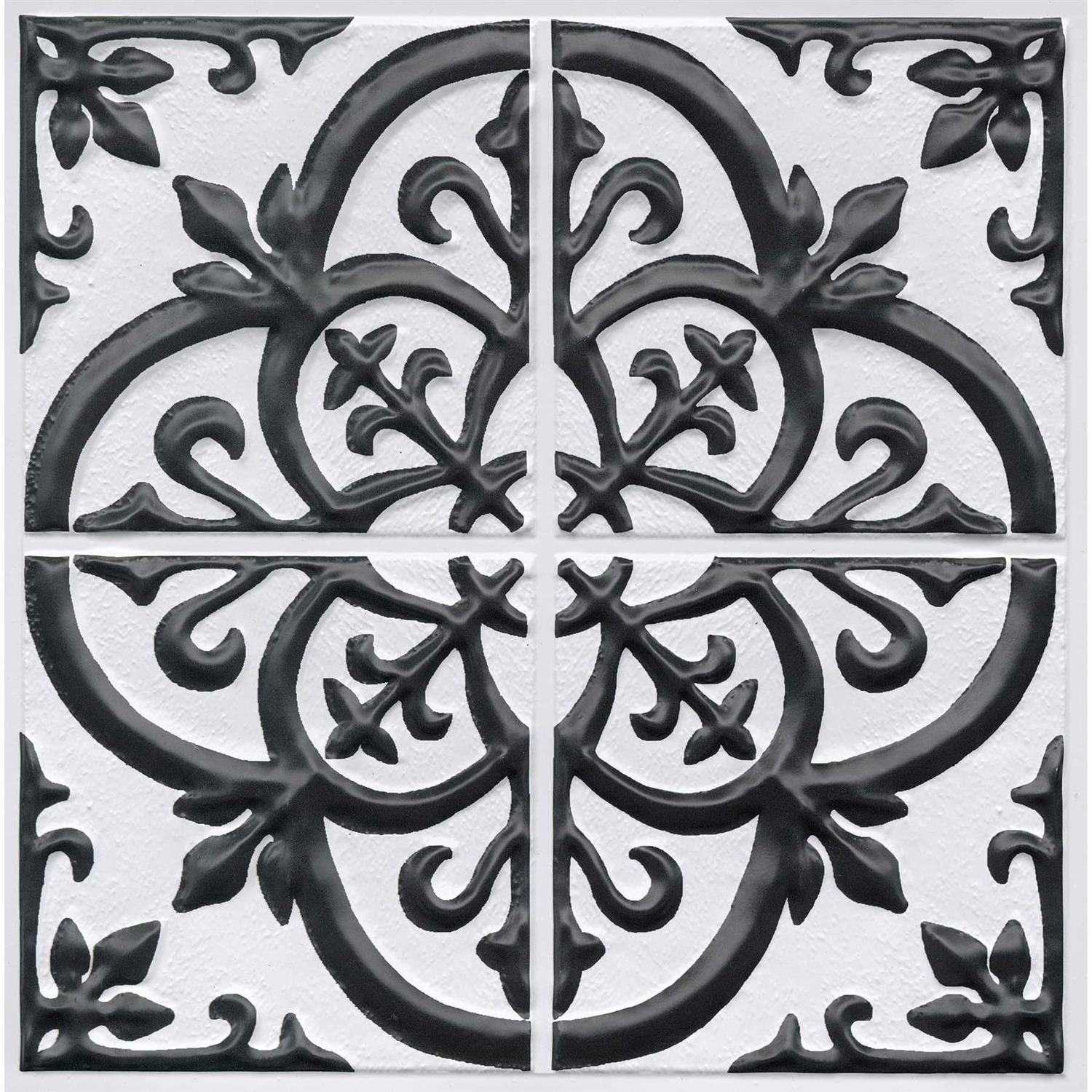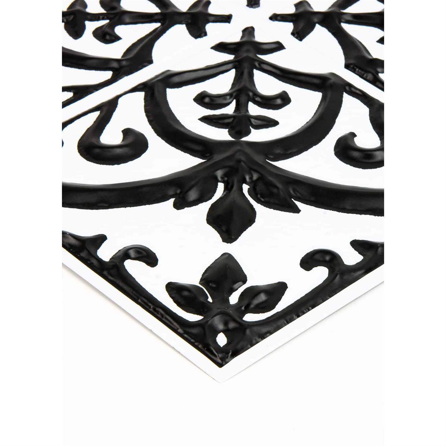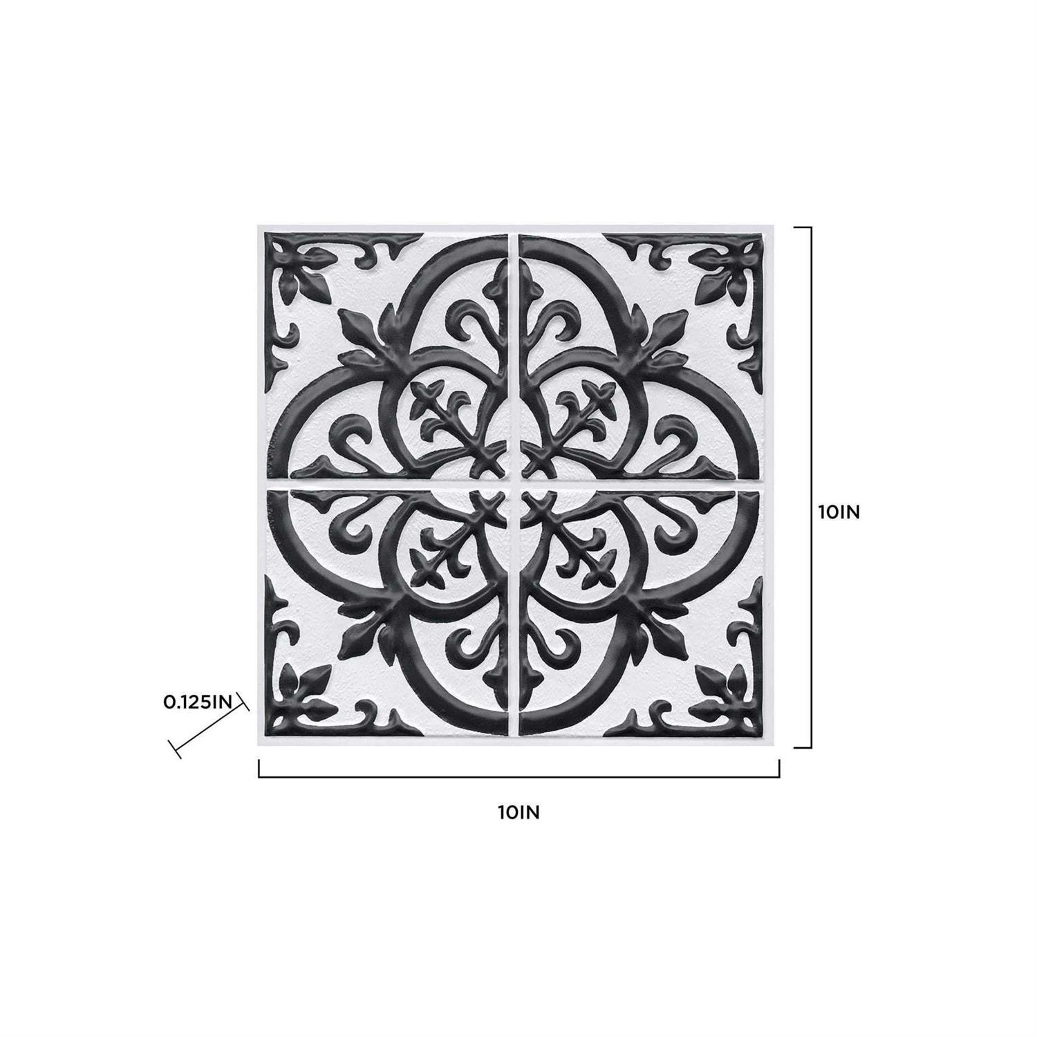 This beautiful black and white peel and stick backsplash features a bold gothic motif, perfect for achieving timeless style in your kitchen or bathroom. With a high shine finish, these tiles will instantly elevate the look of your space. Mason Peel & Stick Embossed Tile Backsplash contains 4 pieces on 4 sheets that each measure 10-in wide by 10-in long. This product measures 20-in wide by 20-in long when assembled.