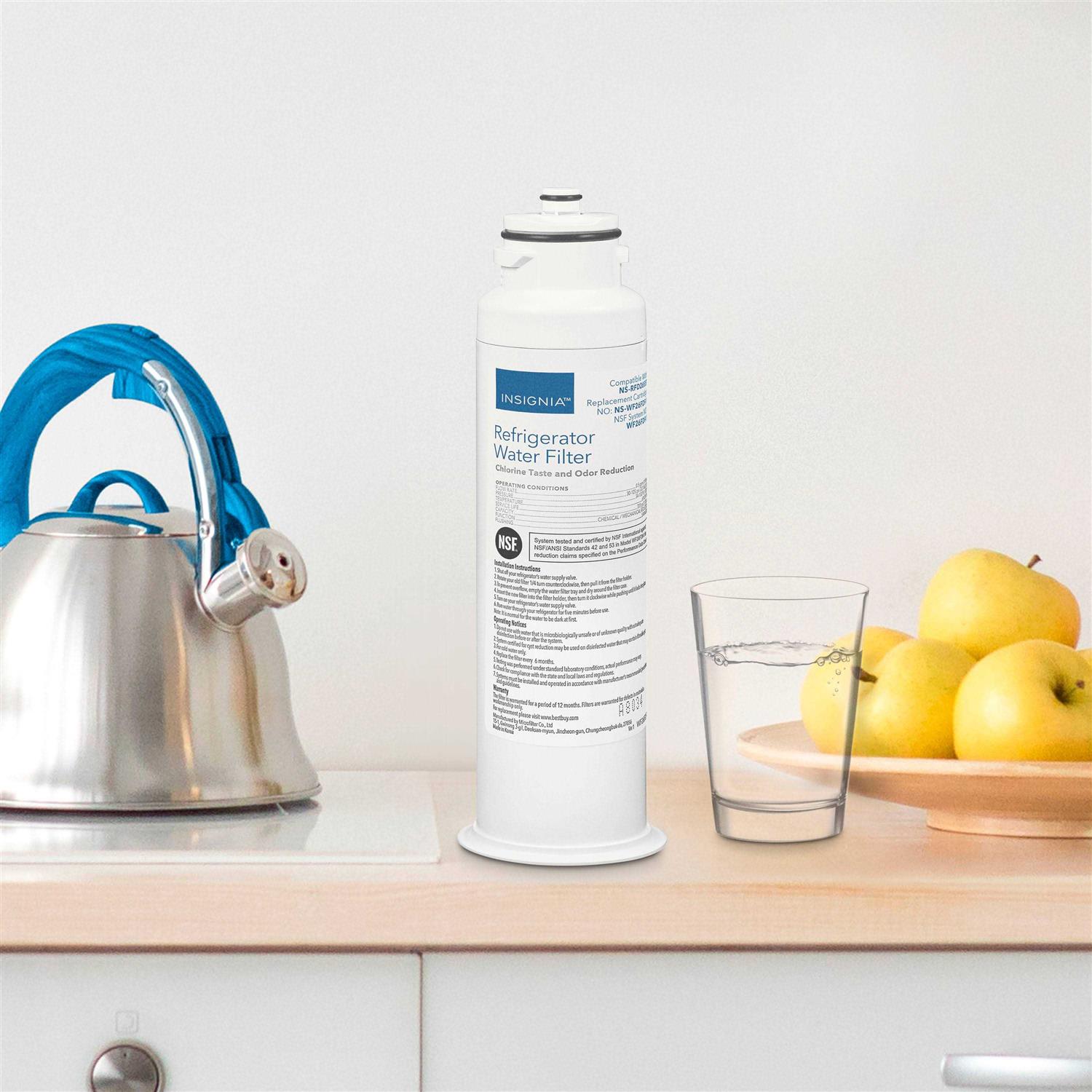 Enjoy fresh water dispensed right from your Insignia French door refrigerator with this Insignia water filter. The unique design retains beneficial minerals while removing contaminants, eliminating cloudiness and improving the flavor. With a life of up to six months or 300 gallons, this Insignia water filter ensures a steady supply of delicious drinking water. Compatible with Insignia NS-RFD26SS9 For use with your existing model. Up to 300 gal. capacity Allows you to have clear, fresh-tasting water. Up to 6-month filter life To keep your water fresh and clean.