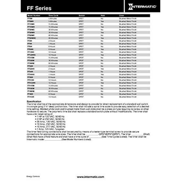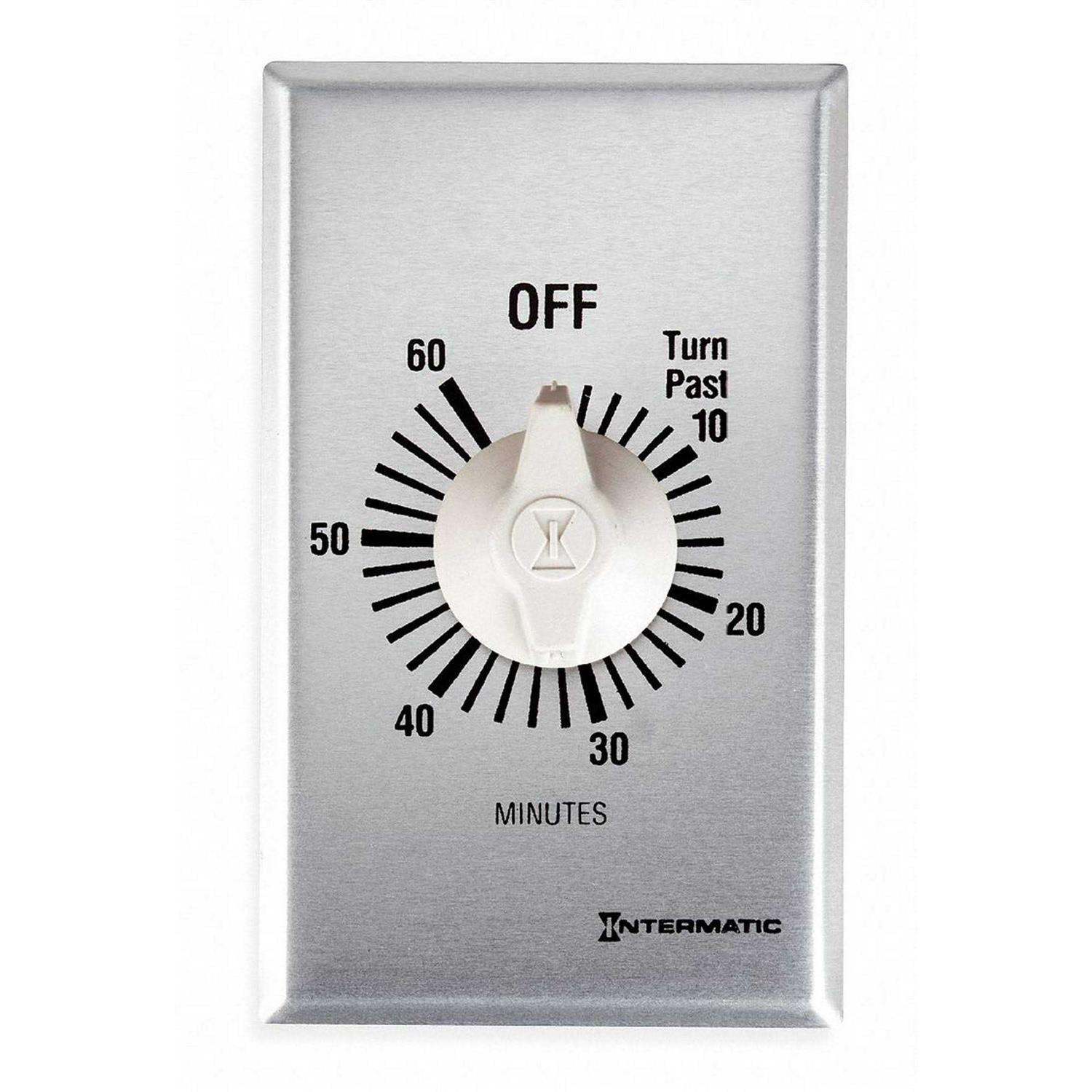 These energy saving timers use no electricity to operate These timers are designed to replace any standard wall switch, single or multi-gang Automatically limit the “ON” time of fans, lights, motors, heaters and other energy consuming loads Time saving “up front” terminal connection with teeter type terminals Easy “press-on” knob design ensure quick and easy installation The Intermatic FF360M is a 60minute commercial autooff timer in a brushed metal finish. It features a rugged time plate which withstand severe commercial environments. This model is designed to operate without electricity; it can replace a standard single or multigang wall switch. This timer automatically limits the ON times for heaters, motors, lighting, fans and other fixtures.The Intermatic FF360M has a 60minute time cycle, the switch configuration is SPDT. Also, there are available models with limits of 5, 15 and 30 minutes and 2, 4, 6 and 12 hours. The pressonknob design of this timer provides easy and quick installation. Please note, that this particular model does not have a Hold feature. This energy efficient autooff timer is CFL compatible.