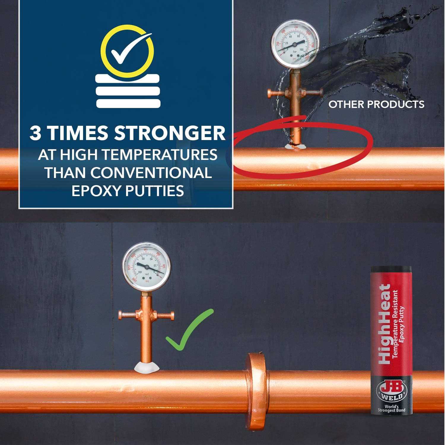 J-B Weld HighHeat is a hand mixable epoxy putty stick specifically formulated to bond and repair materials that will be exposed to high temperatures in automotive and industrial maintenance applications. It cures to a tough, hard bond with little to no shrinkage. This industrial-strength product outperforms conventional epoxy putties at high temperatures and sets in 1 hour at room temperature. After 8 hours, it can be drilled, tapped, machined, ground, filed and painted.HighHeat is rated at a tensile strength of 800 PSI and cures to a machine grey in color. It is able to withstand continuous heat exposure of 400oF and intermittent heat exposure to 550oF.