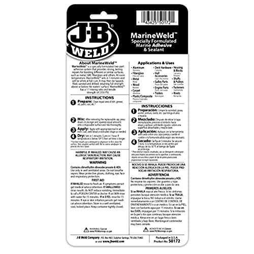 JB Weld 50172 MarineWeld 2-Part Epoxy Resin Syringe | 25 ml – Specially formulated two part Cold-Weld adhesive system that provides strong, lasting repairs for bonding different or similar surfaces, such as metal, composites, fiberglass and others. MarineWeld sets in ²⁰ minutes at room temperature. At full cure, its color is white. It may then be shaped, tapped, filed, sanded and drilled, retaining full strength above or below the waters’ surface. MarineWeld has a ¹:¹ mixing ratio and tensile strength of ³²⁰⁰ PSI.