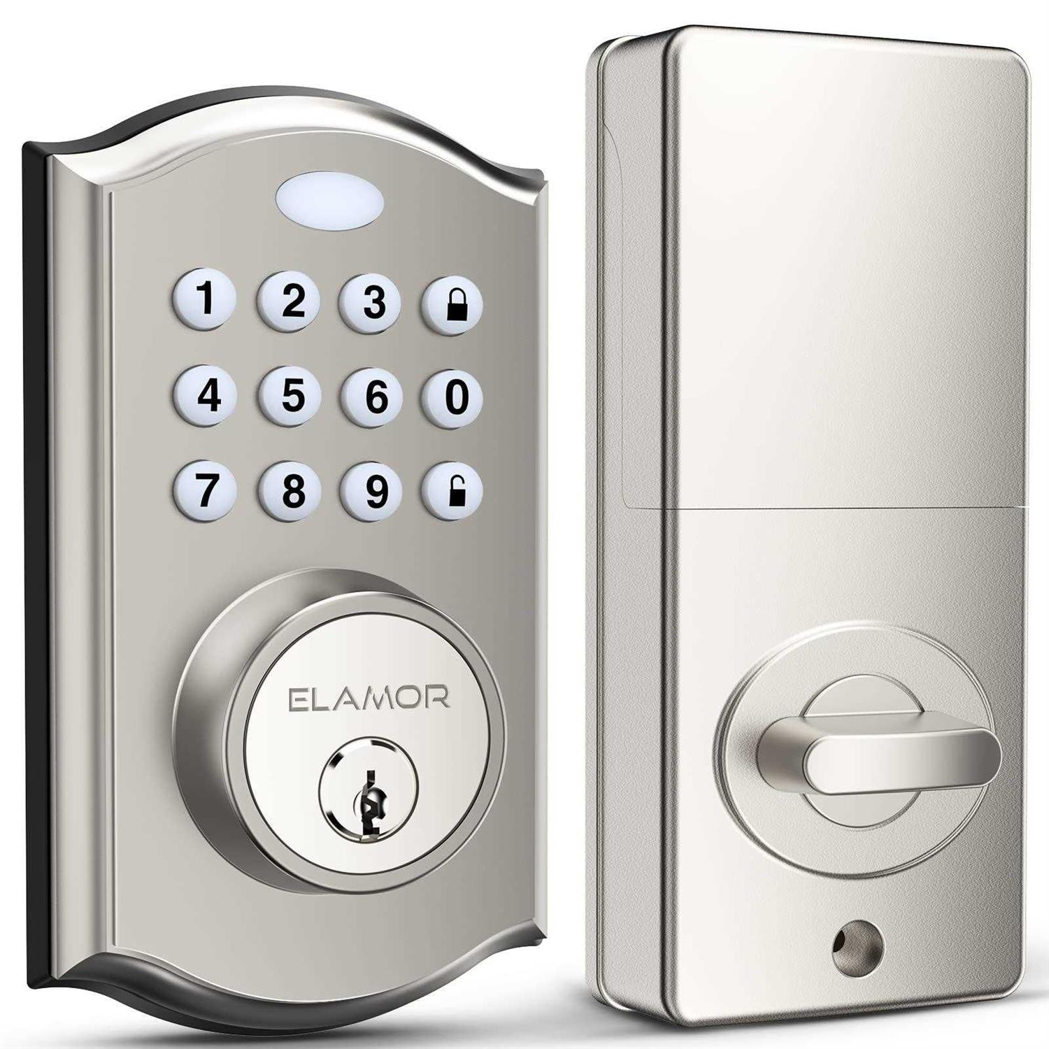 【Keyless Entry Lock】Electronic single-cylinder keypad door locks with custom keyless entry. Optional mechanical keyed override lock available as an additional backup. Deadbolt lock enables up to 50 different user codes plus a master code feature to optimize security. Unlocking can be easier when your arms are full of groceries. 【Install Without Identify Door Orientation】Unlike other locks, ELAMOR has an adaptive left and right door design, so you don’t need to distinguish between the left and right door orientation to quickly install. Truly realize a fast, simple and easy installation. With 15 minutes and a screwdriver, you can easily install this lock without the need for an expensive locksmith. 【Security and Durability 】The Solid lock cylinder and the premium chip protect you with anti-hack security so you don’t need to worry about breaches. The IP54 waterproof design of this smart deadbolt makes it impervious to rain. The low-battery indicator will remind you to replace the battery in time, which in normal circumstances can last up to 1 year. Smart door locks are ideal for front doors, home use and apartments. 【Auto-Lock Safety】This keypad door lock allows you to set it to lock automatically after 3 to 30 seconds, so you never have to worry about whether you’ve locked the door or not. The durable, silicone-coated numbers glow when pressed, making it easy to enter your code even in the dark. 【Maximum Convenience】Give your pet sitter the password to enter your place once when you’re out of town and assign up to 50 different passwords to trusted friends and family to experience convenience. The keyless deadbolt is equipped with an alarm alert function that automatically locks within 90 seconds when it has been tried and tested 5 times. Keyless Entry Lock – Electronic single-cylinder keypad door locks with custom keyless entry. Optional mechanical keyed override lock available as an additional backup. Deadbolt lock there are 50 user codes plus a master code feature for added security. Unlocking can be easier when your arm is full of groceries. Security and Durability – Solid lock cylinder and premium chip protect you with anti-hack for peace of mind. The IP54 waterproof design of this smart deadbolt makes it impervious to rain. The low-battery indicator reminds you to replace the battery in time, which in normal circumstances can last up to 1 year. The Smart door locks is ideal for front door, home use and apartment. Easy installation – Replace an existing deadbolt yourself with no skill required. The digital door locks install in minutes with holes in the door. High-quality metal construction provides strength where it counts. keyless entry door lock deadbolt offers trusted security and durability for residential and light commercial applications. Auto Lock Safety – This keypad door lock allows you to set it to lock automatically after 3 to 30 seconds, so you never have to worry about whether you’ve locked the door or not. The durable, silicone-coated numbers glow when pressed, making it easy to enter your code even in the dark. Maximum Convenience – Give your pet sitter the password to enter your place once when you’re out of town and assign up to 50 passwords to trusted friends and family to experience convenience. The keyless deadbolt is equipped with an alarm alert function that automatically locks within 90 seconds when it has been tried and tested 5 times.
