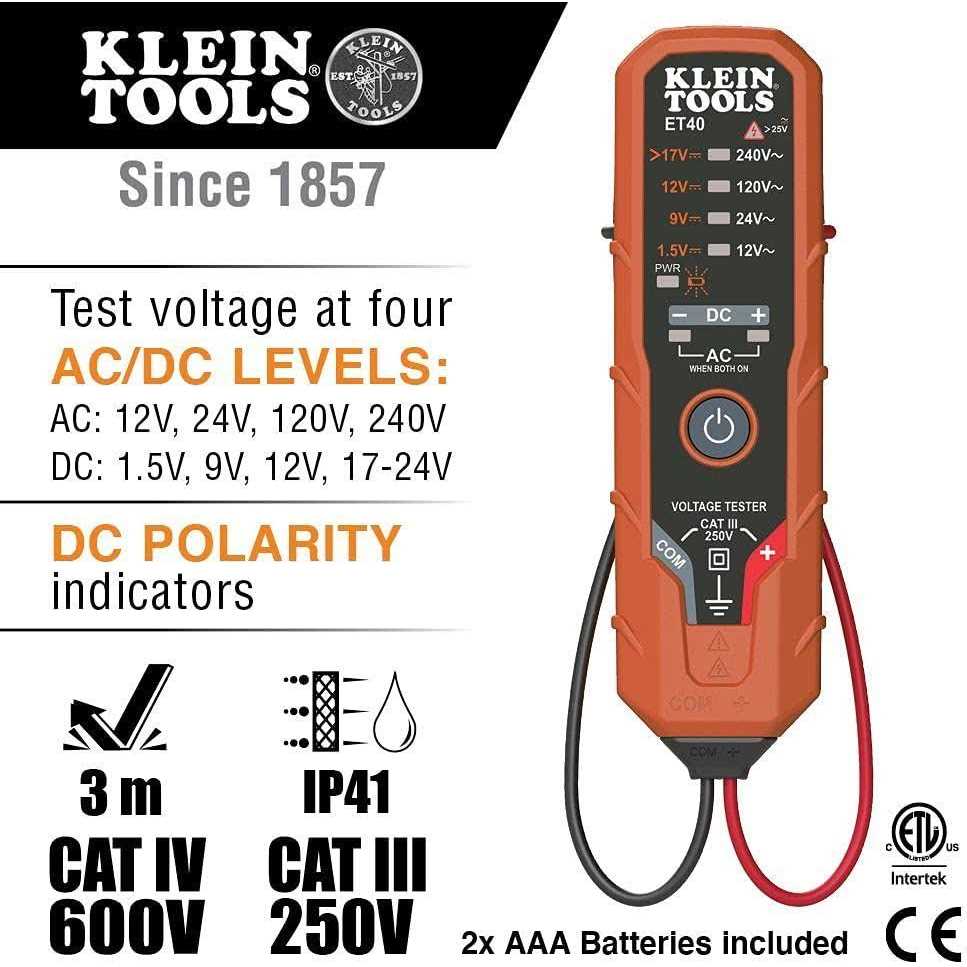 Klein Tools Electronic AC/DC Voltage Tester Klein Tools Electronic AC/DC Voltage Tester Features: Tests AC voltage from 12V to 240V AC Tests DC voltage from 1.5V to greater than 17V to 24V 3-meter drop tested CAT III 250V Class 2 Double insulation IP41 dust and water-resistant Uses 2 x AAA batteries Identifies and distinguishes AC or DC voltages Klein Tools ET40 is an Electronic AC/DC Voltage Tester. It features indicators for positive and negative DC polarity and tests DC voltages as low as 1.5V. It tests AC voltages 12-240VAC. Excellent for checking, verifying or troubleshooting common residential electrical wiring in electrical outlets, light fixtures, doorbells and more. It operates on 2 x AAA batteries.