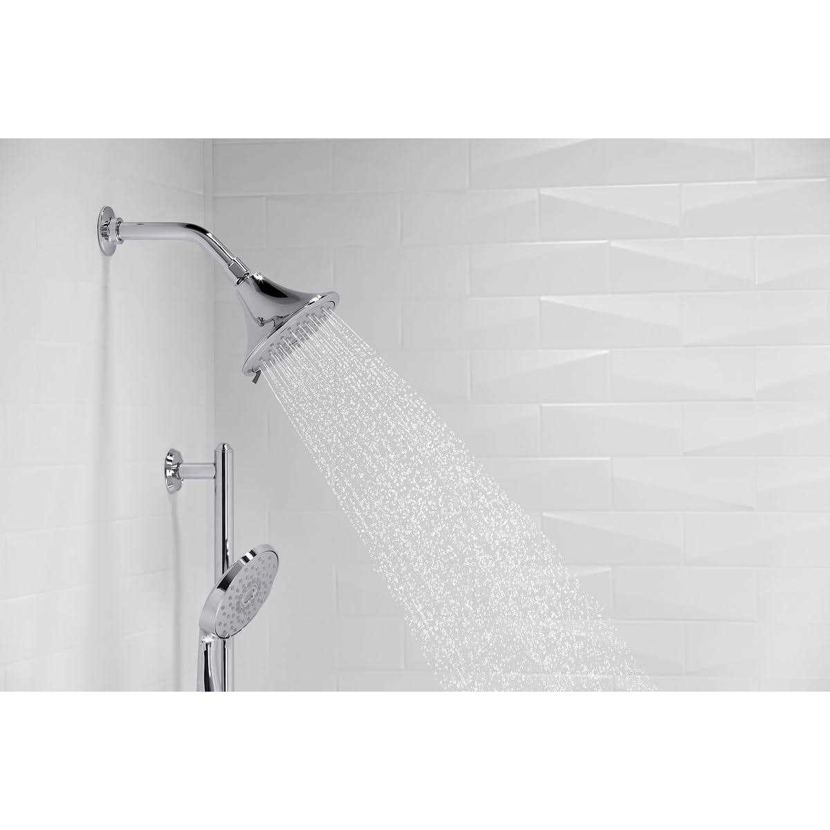 Enjoy luxurious showering combined with up to 30 percent water savings. This Forte 1.75-gpm showerhead provides three distinct sprays – full coverage, pulsating massage, or silk spray – all enhanced with Katalyst technology for a completely indulgent showering experience. By infusing two liters of air per minute, Katalyst delivers a powerful, voluptuous spray that clings to the body with larger, fuller water drops. Full coverage spray produces an encompassing spray for everyday use and utilizes Katalyst air induction to create large, full drops. Pulsating massage spray targets sore muscles to ease away aches and pains. Silk spray releases a dense, luxurious spray ideal for rinsing. MasterClean spray nozzles prohibit mineral build-up for easy cleaning. Thumb tab allows for a smooth transition between sprays. 1.75 gpm (gallons per minute) flow rate. Shower arm and flange not included.