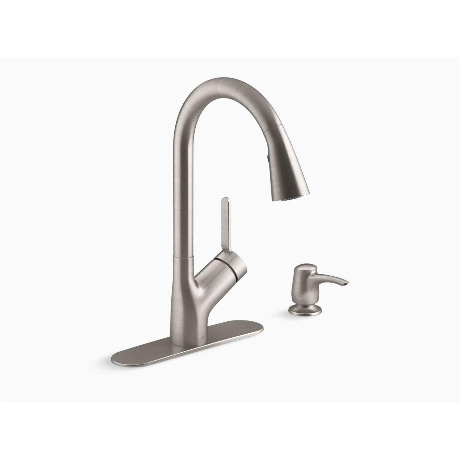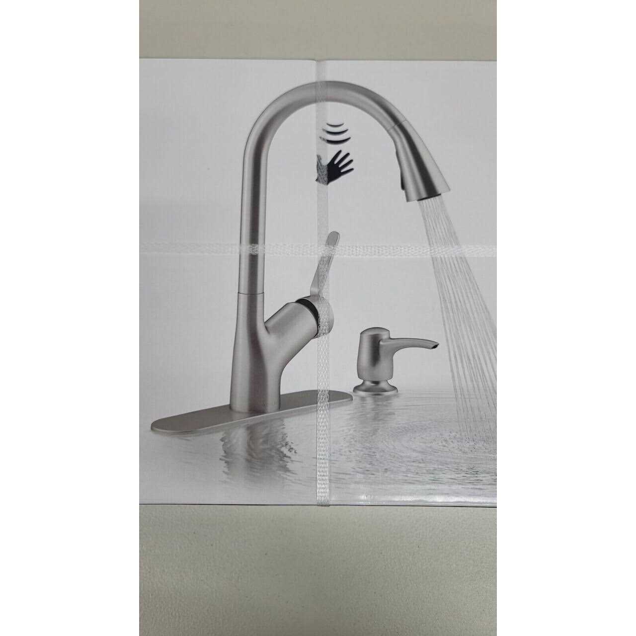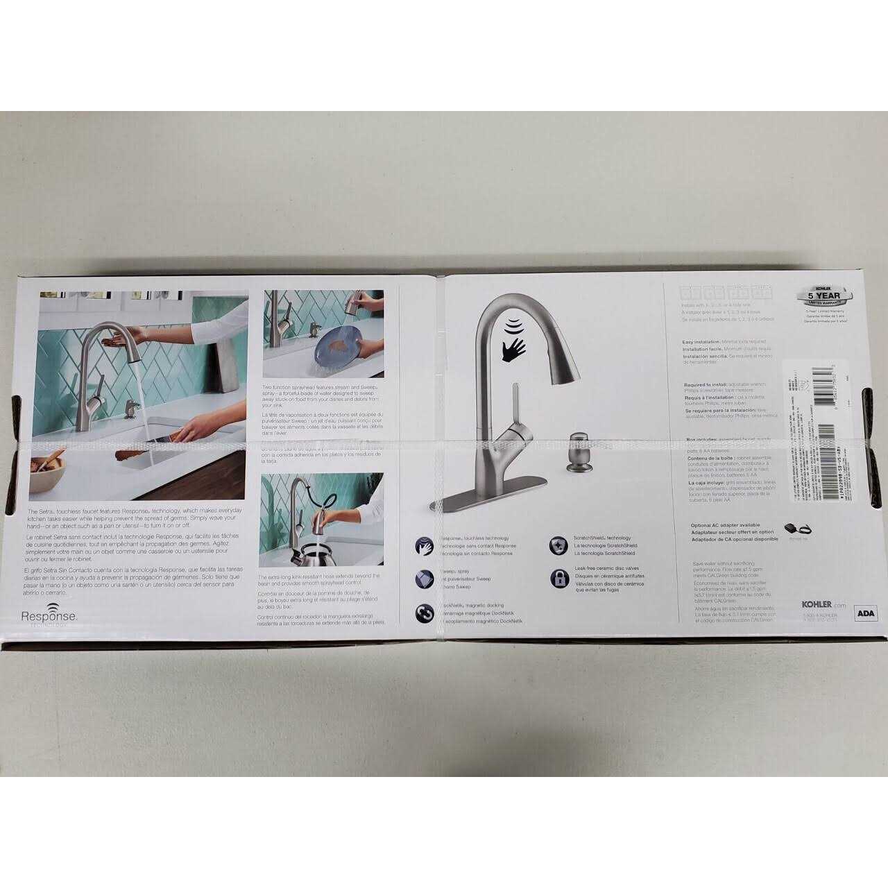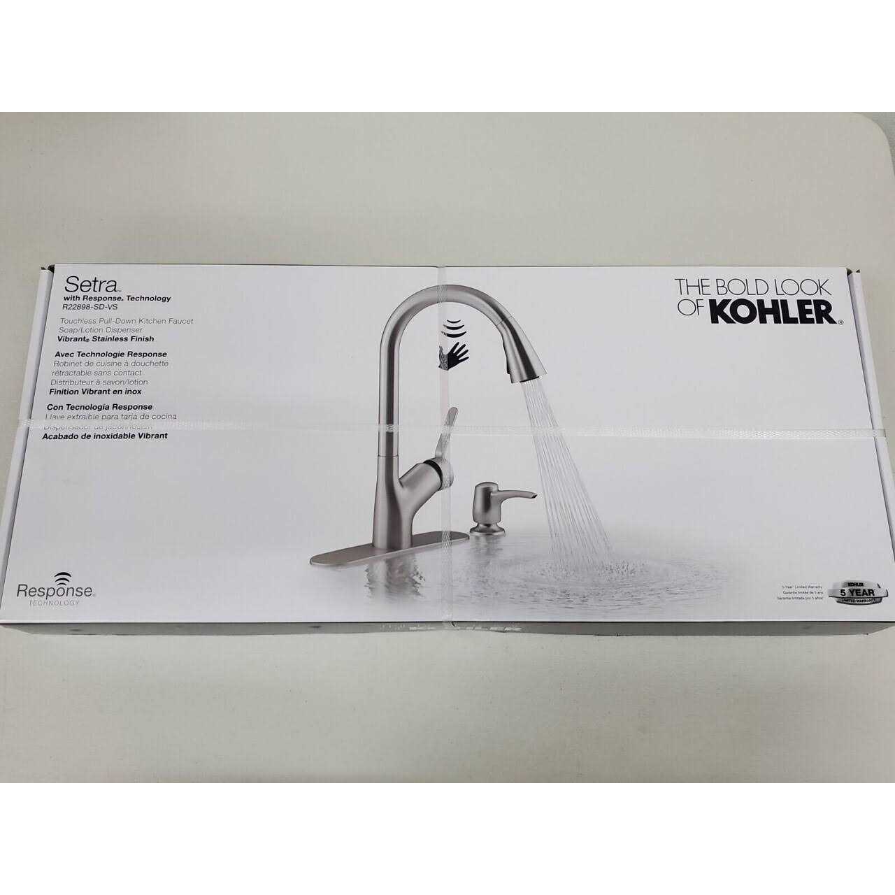 Kohler Setra Single-Handle Touchless Pull-Down Sprayer Kitchen Faucet in Vibrant Stainless Product Details Package Dimensions : 29.4 x 12.1 x 3 inches; 8.7 Pounds Date First Available : October 14, 2019 Manufacturer : Kohler Best Sellers Rank: #163,949 in Tools & Home Improvement (See Top 100 in Tools & Home Improvement) #16 in Touchless Kitchen Sink Faucets #16 in Touchless Kitchen Sink Faucets Customer Reviews: 4.9 out of 5 stars 15 ratings Touchless on/off with a wave of your hand or an object such as a pan Powered by six AA batteries (included), AC power adapter is also available (K-R31498-NA, sold separately) Flexible supply lines and quick-connect fittings make installation easy 2-function pull-down spray head with touch-control allows you to switch between stream and sweep spray With a modern profile and smooth edges, the Setra touchless kitchen faucet hasa sleek aesthetic that blends seamlessly into nearly any kitchen decor. – Touchless technology helps reduce messes and makes kitchen tasks easier. – Simply wave your hand or an object such as a pan or utensil to turn the fauceton or off. The pull-down spray head featuring Sweep spray delivers a wide,forceful spray, simplifying kitchen cleanup. Touchless on/off with a wave ofyour hand or an object such as a pan Response technology uses a state-of-the-art motion sensor for reliable touchless activation Powered by six AAbatteries (included), AC power adapter is also available (K-R31498-NA, soldseparately) 2-function pull-down spray head with touch-control allows you toswitch between stream and sweep spray Sweep spray is a wide, powerful blade ofwater that sweeps your dishes and sink clean Dock – Netik magnetic docking systemsecurely locks the sprayhead into place to prevent dangling Pro – Motiontechnology allows the pull-down sprayhead to swivel for more comfortable useMasterClean spray face withstands mineral buildup so you can wipe clean with adamp cloth no chemical cleaners needed High-arch swing spout offers verticalclearance for tall cookware and pitchers Single lever handle makes adjustingwater temperature easy with one hand KOHLER ceramic disc valves exceedindustry longevity standards, ensuring durable performance for life 1.5 GPM(gallons per minute) maximum flow rate at 60 psi Box includes: assembledfaucet, supply lines, escutcheon plate, top-fill soap/lotion dispenser, six AAbatteries Premium metal construction KOHLER finishes featuring Scratch – Shieldtechnology withstand even the toughest daily use Installs with 1-, 2-, 3- or4-hole sink (escutcheon plate included) Flexible supply lines and quick-connect fittings make installation easy