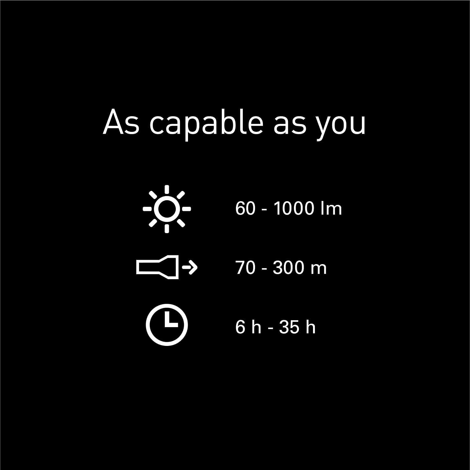 - Shines up to 1000 lumens up to 300 metres for up to 35 hours; Instantly focuses from flood to beam with a single motion with our Advanced Focus System