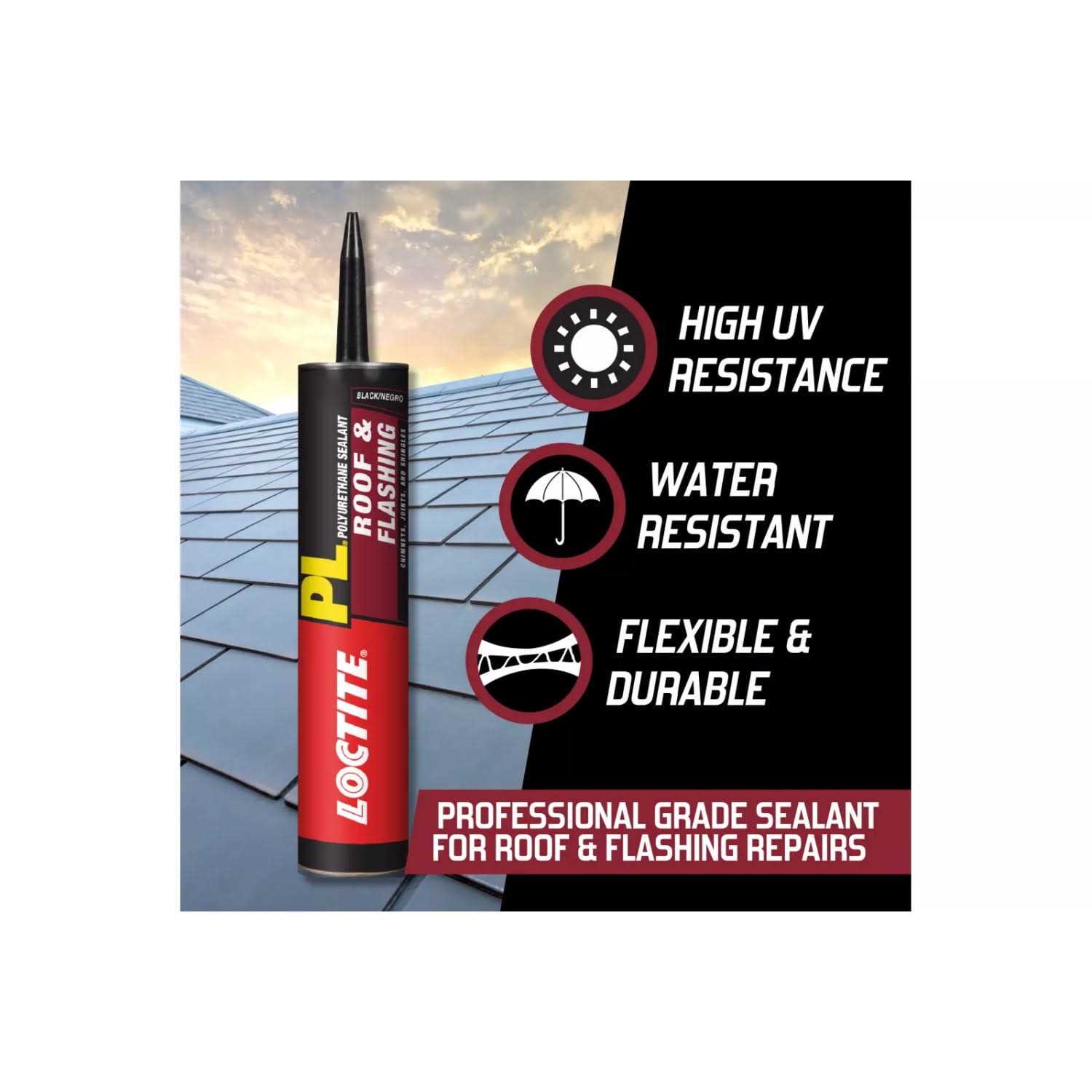 Loctite PL Roof and Flashing Polyurethane Sealant is a premium quality professional grade sealant developed especially for forming permanent, weatherproof seals for gaps and joints on roofs and chimneys. The durable formula has 25% movement capability allowing for shifts inbuilding materials without jeopardizing the seal. PL Roof and Flashing can withstand harsh UV rays and other harsh exterior elements for a long-lasting durable seal. Loctite PL Roof and Flashing is a low VOC formula that meets strict federal and state guidelines. Product color is Black. Product comes in a 10 fl oz Cartridge.