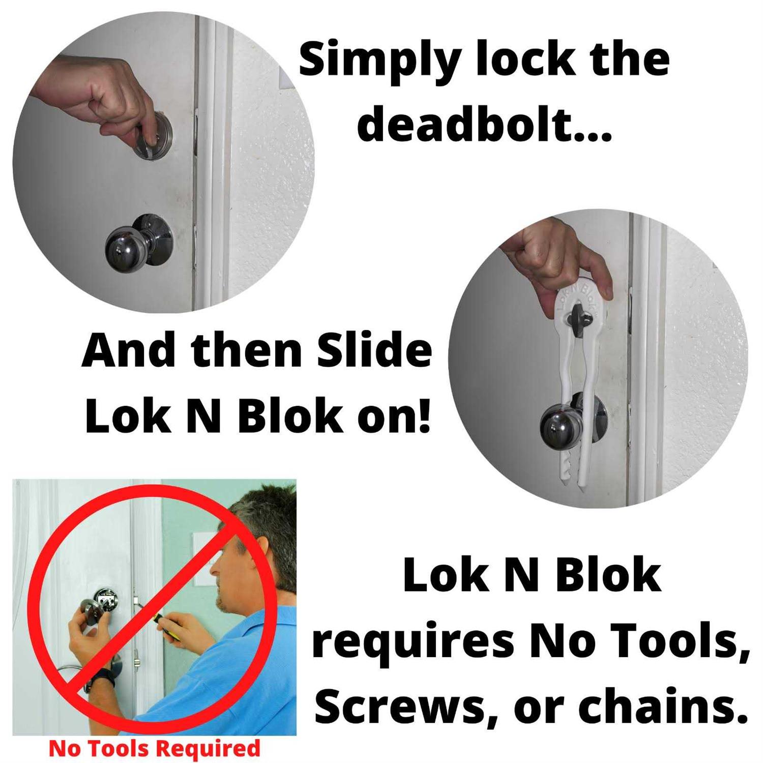 - Simply lock the deadbolt and slide Lok N Blok on ️NO TOOLS OR ALTERING REQUIRED
