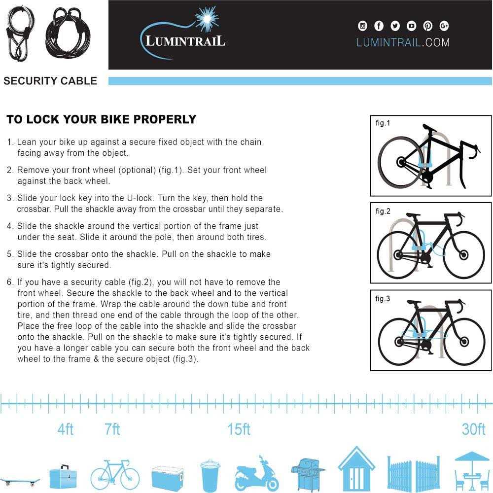 The Lumintrail looped end cable is a perfect solution for protecting your bicycle or securing other valuables against theft. The flexible braided steel cable provides strong cut resistance and maximum strength. Double-looped ends allow for use with pad-locks, u-locks, or disc-locks. Features: High Quality Braided steel construction. Vinyl Covering protects against rust and scratching. Looped ends held securely by steel collars. Cable Dimensions: 4-FT length: 12mm diameter 7-FT length: 12mm