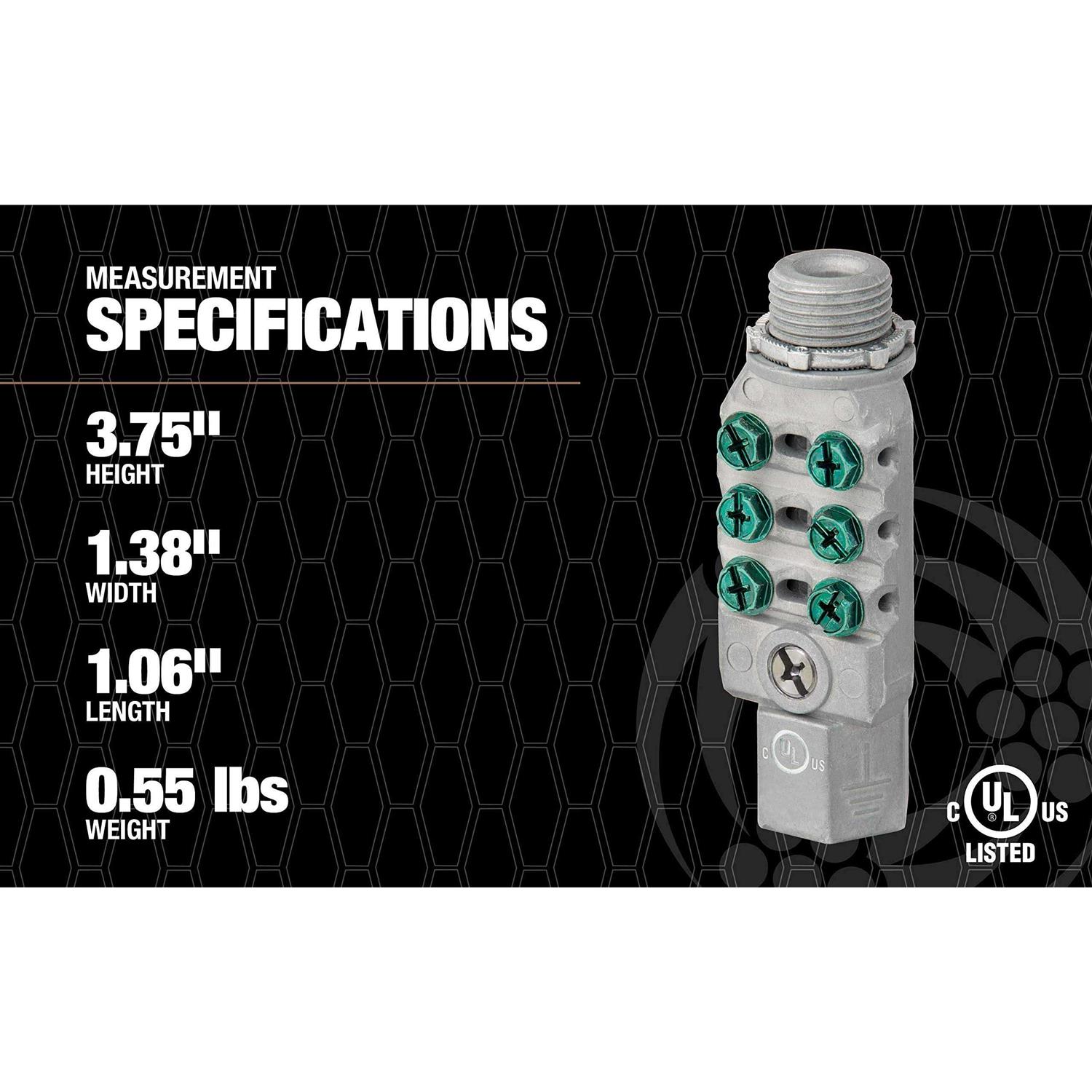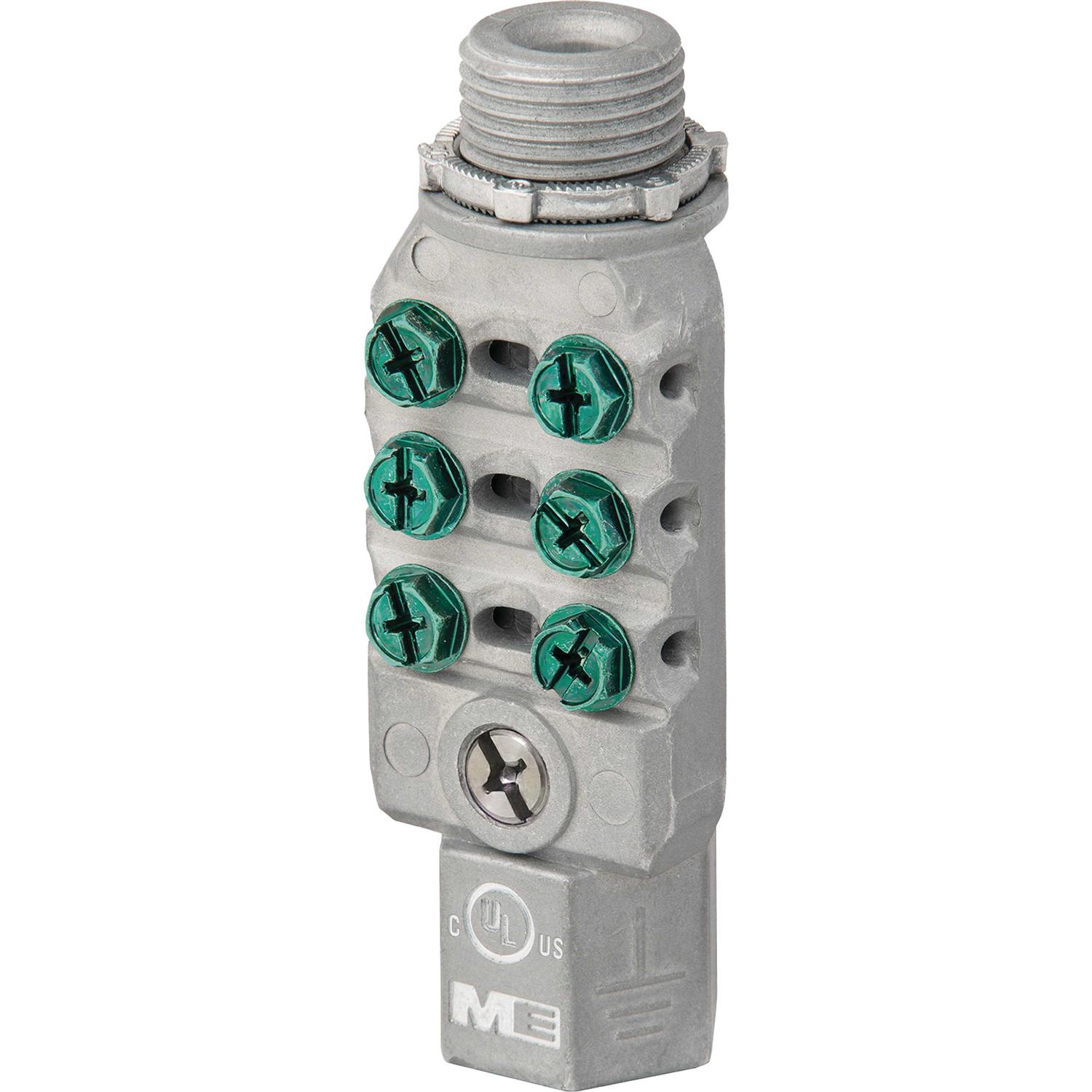 Provides a dependable method for grounding and bonding for electrical systems. When used with conduit, it provides protection against damage and theft of the main ground. Main ground conductor is isolated from communications lines. Incorporates six (6) terminating points (2x the amount required by the NEC). Eliminates creating holes in building that could allow ingress of water. Mounts to enclosures, conduit bodies, and inline with conduit.