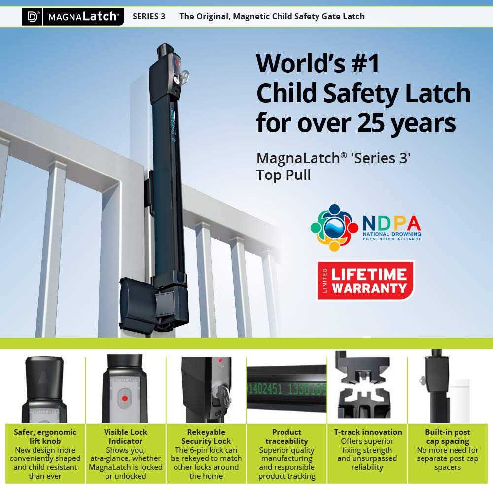 The Magna-Latch Series 3 Top Pull Safety Gate Latch in black features a new visible lock indicator 6-pin re-keyable security lock and both vertical horizontal alignment indicators and much more. The re-keyable lock can be re-keyed by a locksmith to match doors. It’s been tested to 2 million cycles and it’s 50% stronger than before. Simply put it’s the world’s #1 child safety gate latch.Made from hi-tech engineering polymers and stainless-steel components Magna-Latch Gate Latches are suitable for mounting to most gates and gate materials. This Magna-Latch S3 Top Pull is recommended for gates 5 feet in height and 3 feet wide. This lock is for square post and fence materials of wood metal or vinyl. A round post adaper is available but sold separately. Designed specifically for toddler-resistant gates around swimming pools childcare centers schools and homes these Australian-made latches use patented magnetic technology and super-strong permanent magnets. You can see at a glance if your gate is not secured. Millions of the award-winning Magna-Latch have been sold worldwide.When installing this latch to a swimming pool gate always confirm any safety requirements with your local authorities to ensure compliance.