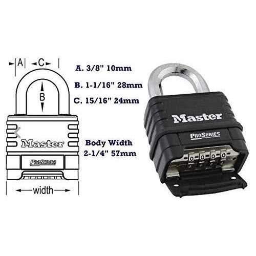 Master Lock 2-1/4 Inch (57mm) ProSeries Zinc Die-Cast Resettable Combination Padlock (Black) Master Lock 2-1/4 Inch (57mm) ProSeries Zinc Die-Cast Resettable Combination Padlock (Black) Features: ProSeries resettable combination locks are designed for Commercial/Industrial applications Set-your-own 4-digit combination for convenience and security; 10,000 possible combinations No reset tool required Large ergonomic dials with exclusive blind dial feature permit operation with gloves, in low light or complete darkness Deadlocking mechanism protects against prying, shimming, and rap attacks Shackle seal and dial dust cover protect internal components and dials for trouble-free operation 2-1/4in (57mm) wide die-cast body for strength and durability 1-1/16in (28mm) octagonal boron-carbide shackle for excellent cut resistance The Master Lock No. 1178 ProSeries Resettable Combination Padlock is designed for commercial/industrial applications and features a 2-1/4in (57mm) wide die-cast body for strength & durability and a 1-1/16in (28mm) tall, 3/8in (10mm) octagonal boron-carbide shackle for ultimate cut resistance. A set-your-own combination feature offers convenience and security with 10,000 possible combinations – no reset tool required – and a deadlocking mechanism protects against prying, shimming, and rap attacks.