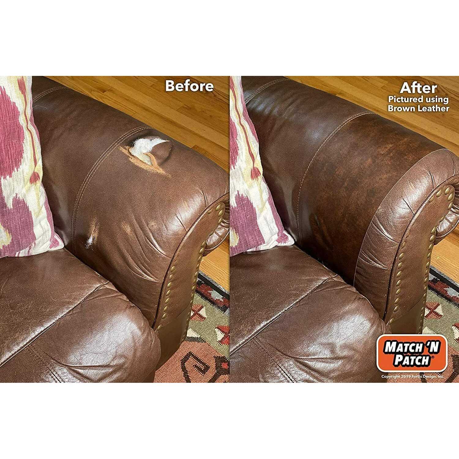 Match ‘N Patch tapes are designed for quick patches and cover ups of scratches and holes. It is a quick and easy way to repair, conceal and transform furniture, bags, boxes and more. Each print is seamless and lines up for easy covering of larger surfaces. Match ‘N Patch tape is best used to repair areas that are not major interaction points. Follow our EASY AS 1 2 3 instructions for best results. 1 Clean surface before application. 2 Use scissors or a knife to cut tape. 3 Apply tape evenly. TIPS: Press firmly to secure. Heat the repair for stronger hold. Wait 24 hours for best adhesion. NOTE: Match ‘N Patch tapes use a transparent adhesive with a realistic looking printed leather pattern, and are not actual leather or synthetic leather.n15’ x 2.25 roll of repair tape with realistic looking printed leather pattern. Beautiful and believable print reproduction using high quality adhesive that is extremely durable while also being thin enough to blend perfectly into existing surfa.