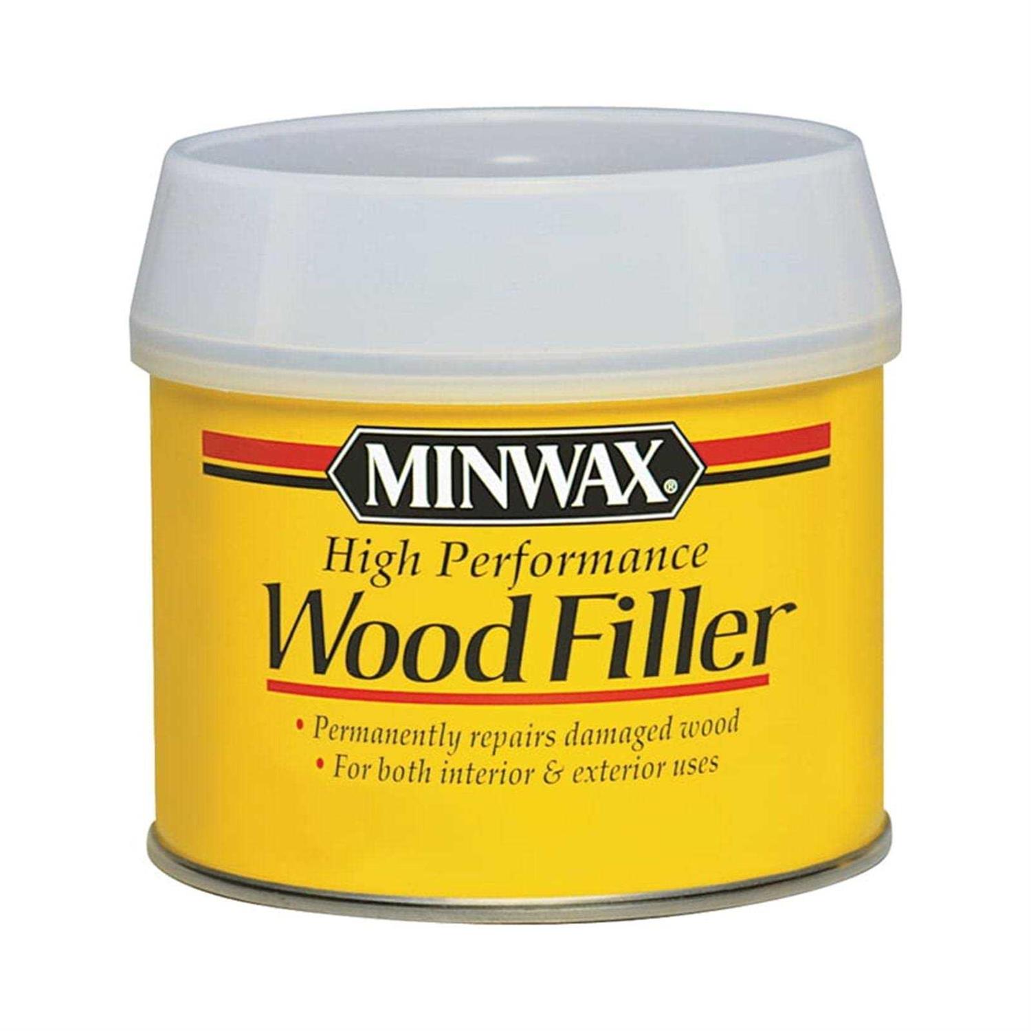 Minwax High Performance Wood Filler permanently repairs damaged and rotted wood. It is used to fill gouges and holes in split, damaged or rotted exterior or interior woods as well as any porous surface. It is weather, water, and rot resistant. Minwax High Performance Wood Filler is also effective as a wood adhesive where you can anchor screws and secure loose joints in furniture. It strongly bonds to wood as well as almost any rigid surface including ceramics, concrete, metal, and fiberglass. Will not shrink, crack or fall out and can be drilled, planed, carved, and screwed into. Hardens in 15 minutes, sandable in 30 minutes. Use on windowsills, doors, woodwork, floors, decks and furniture. Staining High Performance Wood Filler is not recommended. Minwax High Performance Wood Filler accepts stain differently than wood does. It is unlikely that a close color match will be achieved. For repairs that require an exact stain match, use Minwax Stainable Wood Filler.