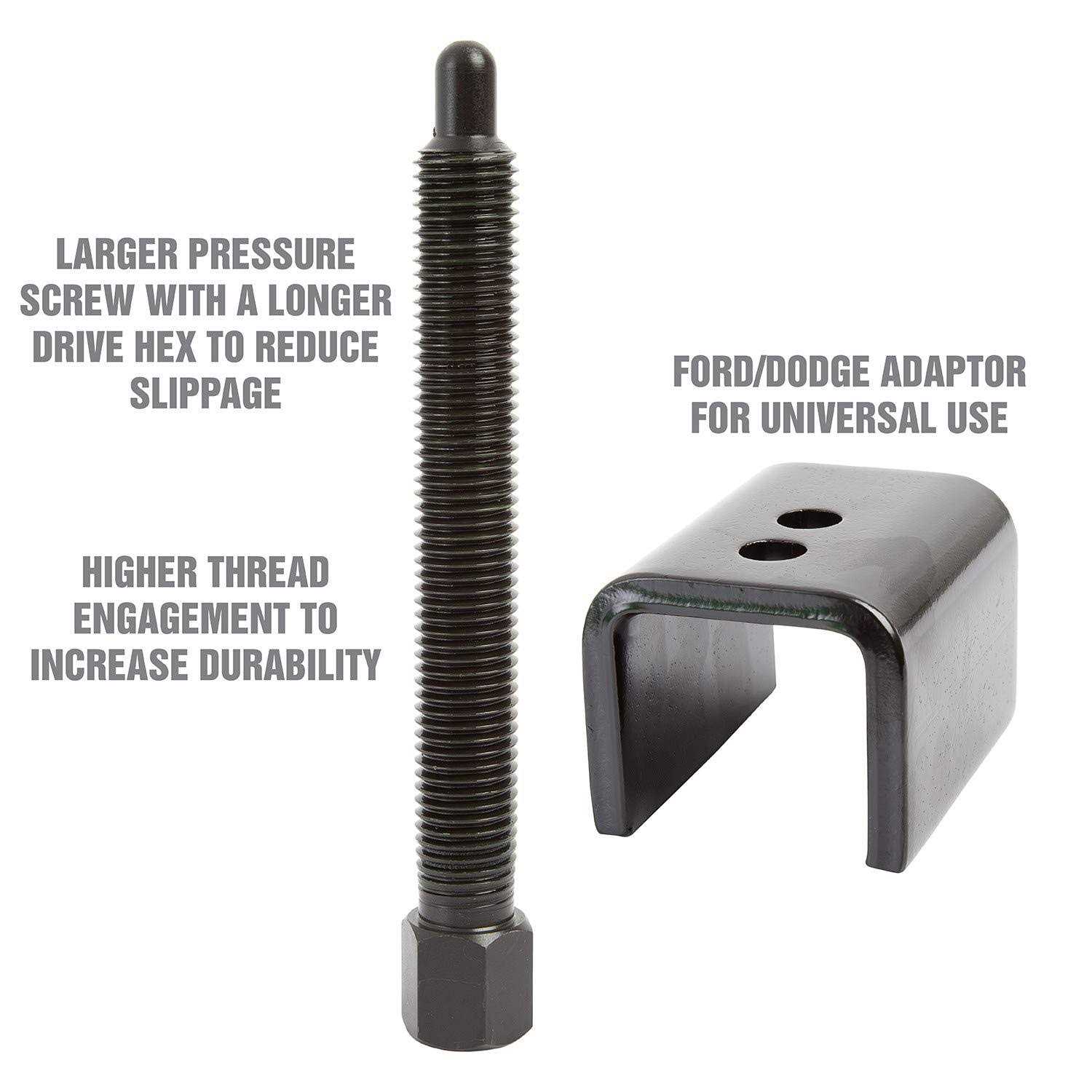 The OEMTOOLS unloading/Installation tool allows incredibly quick and easy removal and installation of torsion bar levers, and safely releases and increases torsion bar tension. The 37237 is an updated version and features an extended “C-clamp” for longer reach, perfect for use with 2011 and up GM Heavy Duty trucks. It also includes our new special Ford/Dodge Adapter for universal use.