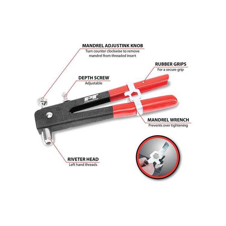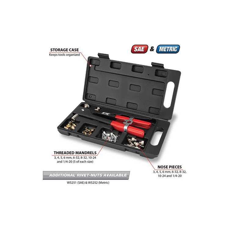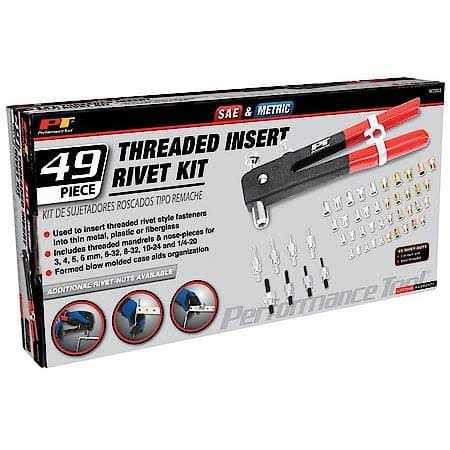 VERSATILE USE: The 49pc Master Threaded Insert Rivet Kit is perfect for inserting threaded rivet-style fasteners into thin metal, plastic or fiberglass, making it ideal for DIY projects and professional use. COMPLETE KIT: The kit includes mandrels and nosepieces for 3mm, 4mm, 5mm, 6mm, 6-32, 8-32, 10-24, and 1/4-20 sizes, making it a comprehensive set that allows you to tackle various projects with ease. ABUNDANT QUANTITY: The kit comes with 5 of each size steel threaded rivet-nut, providing you with 40 pieces in total. You won’t have to worry about running out of inserts for your project. COMFORTABLE GRIP: The long handle of the tool has comfort cushion grips, which reduces hand fatigue during use and allows for extended use without discomfort. EASY ORGANIZATION: The formed blow-molded case keeps the inserts organized and easily accessible. Additionally, the inserts are sold separately as SAE #W5251 and Metric W5252, allowing you to restock only the sizes you need.