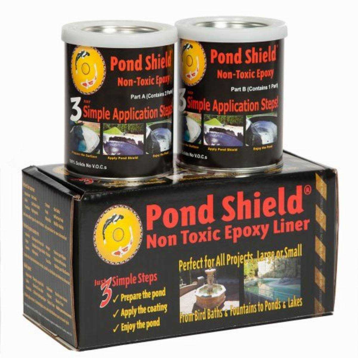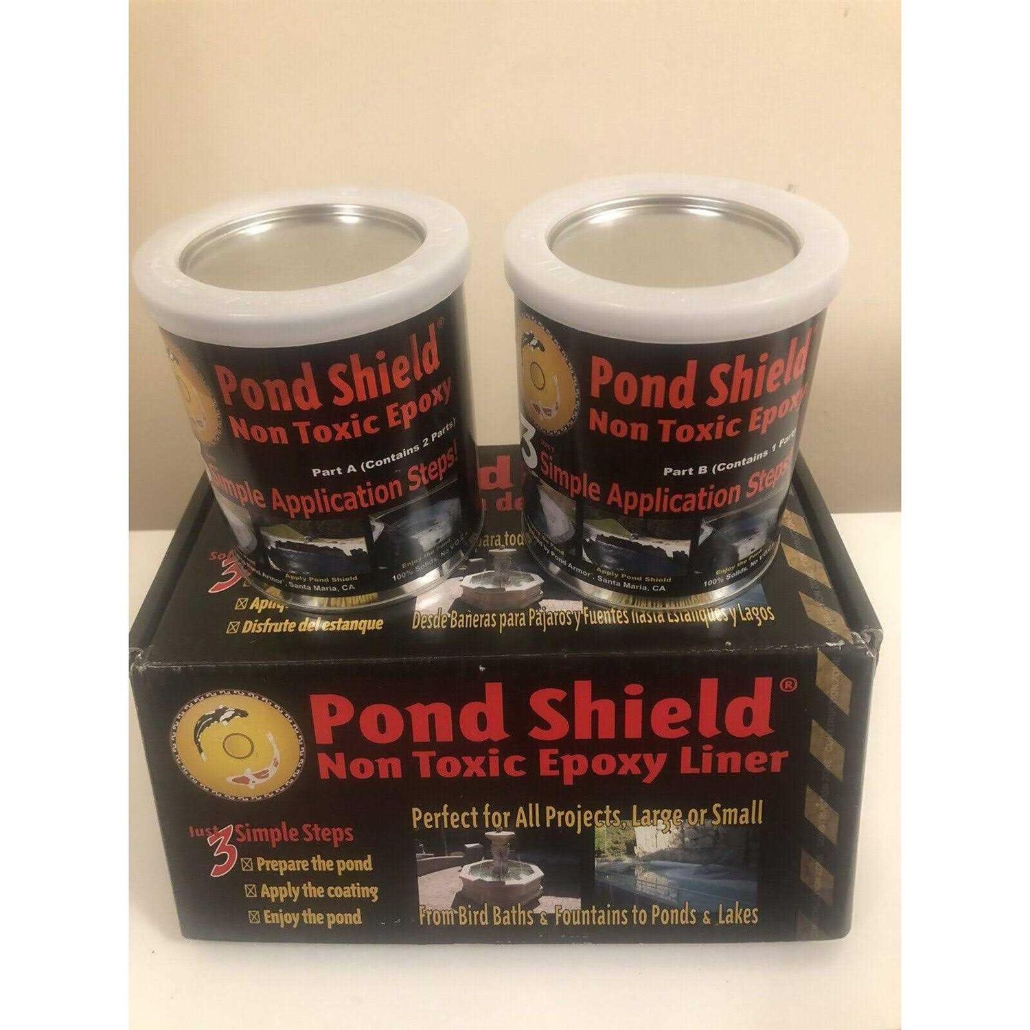Fountain and water feature replacement partspond shield by pond armor is the finest high performance epoxy pond liner and sealer on the market today. The modified epoxy pond coating and sealer developed by pond armor produces an awe-inspiring finished surface that provides a water proof non-toxic barrier for your aquatic environment. Pond shield is a 100 percent fish and plant safe pond coating. Pond shield was designed by pond armor with the hobbyist in mind. After prepping the surface area pond shield rolls on just like paint with a short nap 1/4 paint roller or can be applied with a brush squeegee or even sprayed on. You can use 2-3 oz per kit of denatured alcohol to thin the product for easier use as it is quite thick out of the can. You simply mix both parts with the alcohol and its ready to apply. Pond armors pond shield works great for koi ponds water gardens fountains and waterfallswe always stock it in clear black tan gray white forest greenblueeach pond shield kit is 1.5 Quarts and can cover up to 60 square feet. Thats 60 square feet in just one coat for a total of 10 mils in thickness. Unlike the color versions of pond shield clear pond shield is void of pigments which means each kit is applied in several thin coats eventually being brought up to 10 mils thickness no primers or sealants needed. It can be applied to most surfaces including fiberglass concrete or cement. It is a flexible epoxy and provides a superior elongation. Simply mix both components together and apply just like paint. Cures to touch within a few hours and is safe for aquatic life. This does not mean your epoxy has gone bad. It is just cold. To remedy this tightly replace the lid on your product and place each container in a bucket of hot tap water boiling the water is not necessary. Your pond shi.