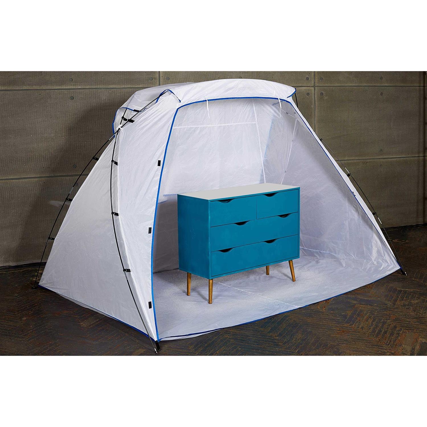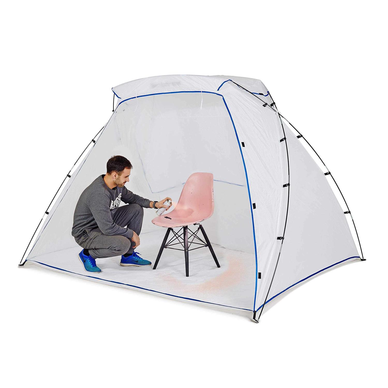 Spray shelter reduces mess and clean up Protect furniture, walls with this portable paint booth. Designed to catch the overspray from your painting and DIY projects, this spray paint tent prevents damage and cuts clean up time by half. With an assembled size of 8.5x6ft (2.6×1.8m) and 5.5ft (1.7m) high, this DIY station is large enough to hold a chest of drawers, chairs, a bench or TV cabinet. Designed to make your life easier Quick and easy to assemble, this spray paint tent can be used as a garage shield, to prevent marks on the walls, or an airbrush spray booth for hobby projects outdoors. It will also help prevent dust and dirt from reaching your finished project as it dries.