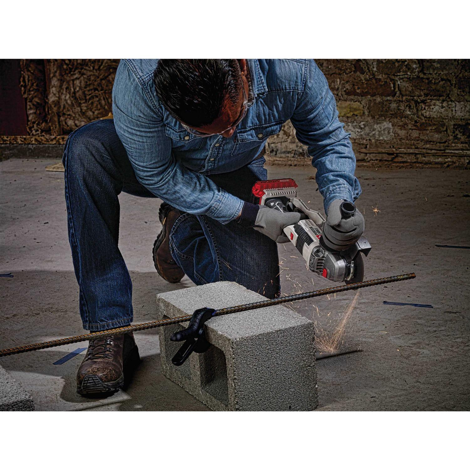 The 20 V Max cut-off grinder features a high-performance motor that allows for aggressive cutting, removal and finishing. The handle is contoured and overmolded for increased comfort. The three-position side handle helps to provide control in multiple positions. A tool-free guard makes guard adjustments quick and easy. The cast metal gear housing helps dissipate heat during extended use and a spindle lock that allows for quick and easy wheel changes. High performance motor produces 8,500 rpm for aggressive cutting, removal and finishing. Cast metal gear housing helps dissipate heat during extended use. Contoured over molded handle optimized for increased comfort. Spindle lock allows for quick and easy wheel changes. 3 position side handle provides control in multiple positions. Tool free guard makes guard adjustments quick and easy. 20 volt max system – high performance cordless platform. 14 inches length; weighs only 5 pounds Battery And Charger Sold Separa tely.