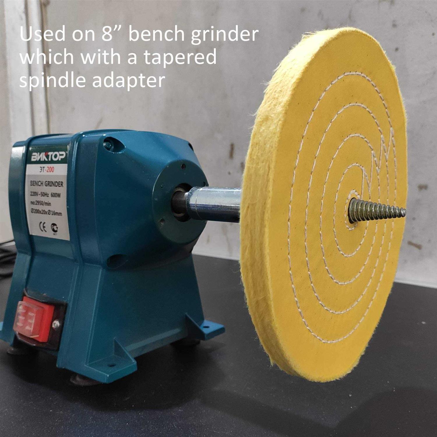 8 Inch buffing wheels kit for bench grinder. Used for polishing and buffing metals to get a mirror surface. Especially great for polishing soft metals and jewelry. As an 8 Inch bench grinder polishing kit, this kit can be installed on a bench grinder which with 5/8 Inch arbor shaft directly or used with a tapered bench grinder spindle adapter together. Very easy to install and use. The First way: fit the bench grinder polishing wheels on the 5/8 Inch arbor shaft and tighten the nut. The Second way: screw into the bench grinder buffing wheels on the tapered bench grinder spindle adapter. Made of 100% fine cotton cloth and high-quality abrasives. Complete bench grinder polishing kit, with coarse to fine buffing wheels and buffing compounds, make your polishing work efficiently. This bench grinder polishing kit Includes: 1PC 8 Inch yellow muslin buffing wheels; 1PC 8 Inch white muslin buffing wheels; 1PC 8 Inch loose flannel buffing wheels; 1PC 100g brown tripoli polishing compound bar; 1PC 100g all-purpose blue polishing compound bar; 1PC 100g jewelers rouge polishing compound bar. 1PC PURUI POLISHING Metal Polishing Guide.
