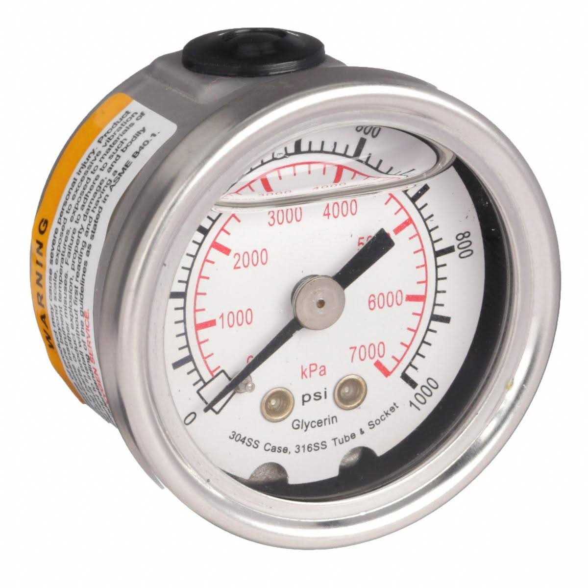 Commercial Pressure Gauge, Nominal Dial Size 1 1/2 in, Accuracy +/-3-2-3 Percent, Gauge Case Material 304 Stainless Steel, Process Connection Type NPT, Process Connection Gender Male, Lens Material Acrylic, Process Connection Size 1/8 in, Field Fillable No, Process Connection Location Center Back, Case Color Silver, IP/NEMA Rating Not Rated, Primary Pressure Range 0 to 1,000, Dry Dampening Feature None, Vibration Resistance Liquid-Filled, Dial Color White