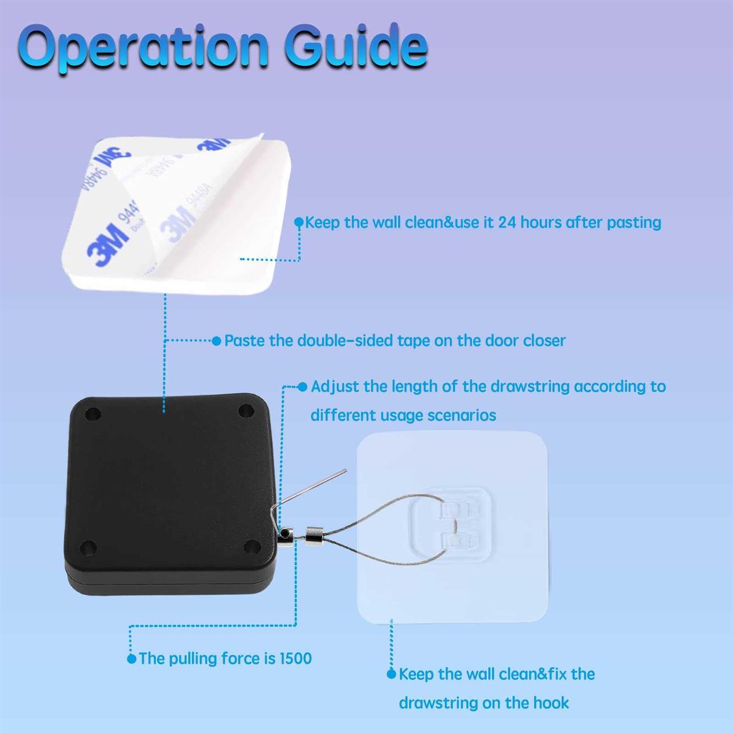1 ️ Package Contents You’ll get 1 pcs of punch-free closer with steel rope, 2 pcs of adhesive hooks, and1pcs of small Allen keys,10 protective pads. 2 ️ Punch Free Door Closer Our auto sensor door closer is very easy to install, punch-free installation, There is an adhesive on back and tape it on the door or wall, taking less than a minute, sturdy and durable. No screwing and no holes in the door and wall, keep your door or wall complete and minimalistic. 3 ️ Automatic Door Closer This door closer is inductive and it can automatically close the door behind you when you don’t remember close the door to prevent the pets sneaking into your room uninvited. You will never worry about the pets make your room messy any more! 4 ️ Wide range of application this steel drawstring automatic door closer is suitable for any interior door, sliding door, wood or metal door, residential or commercial door, it can solve your problem of closing doors in different places. 5 ️ Long service life the punch-free door closer has undergone various tests, including tensile life test, breaking force test and low temperature test, and the service life of the door closer was detected to be about 20,000 times, and the rebound test was conducted under 1500G tensile force. 5 ️【Long service life】 the punch-free door closer has undergone various tests, including tensile life test, breaking force test and low temperature test, and the service life of the door closer was detected to be about 20,000 times, and the rebound test was conducted under 1500G tensile force.