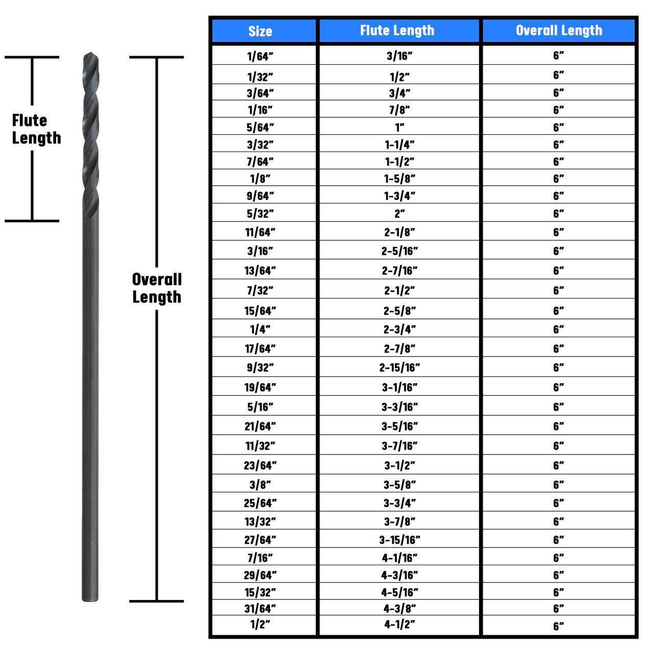 Manufactured to Aerospace Standard 907. The 135 degree split point is self-centering and reduces thrust. Ideal for drilling in mild steel where extra length for reach is required. They have a black oxide surface treatment that is abrasion resistant, reduces chip welding and improves chip flow. Sizes smaller than 1/16 and #52 have the 118 degree standard point.