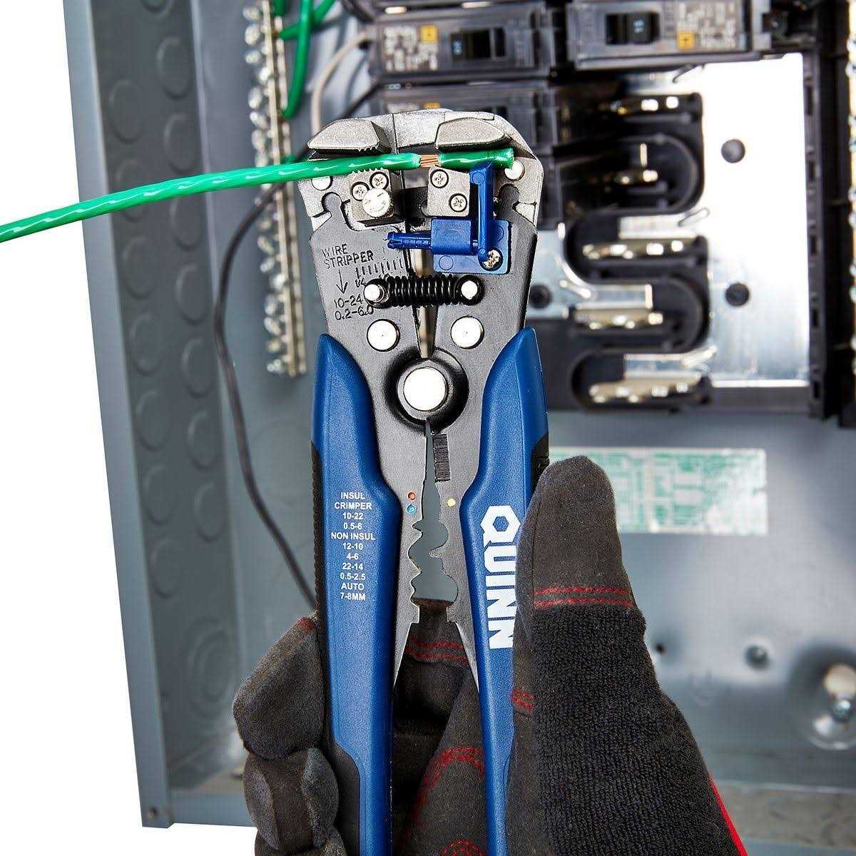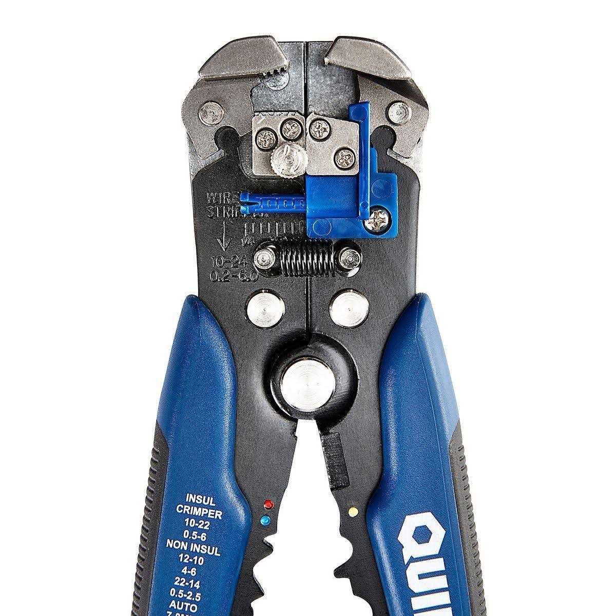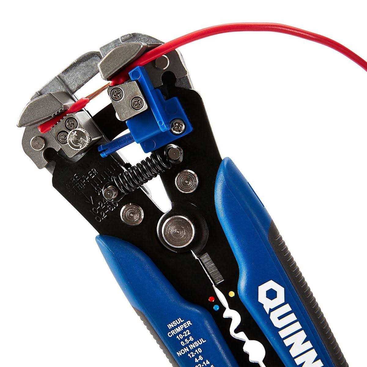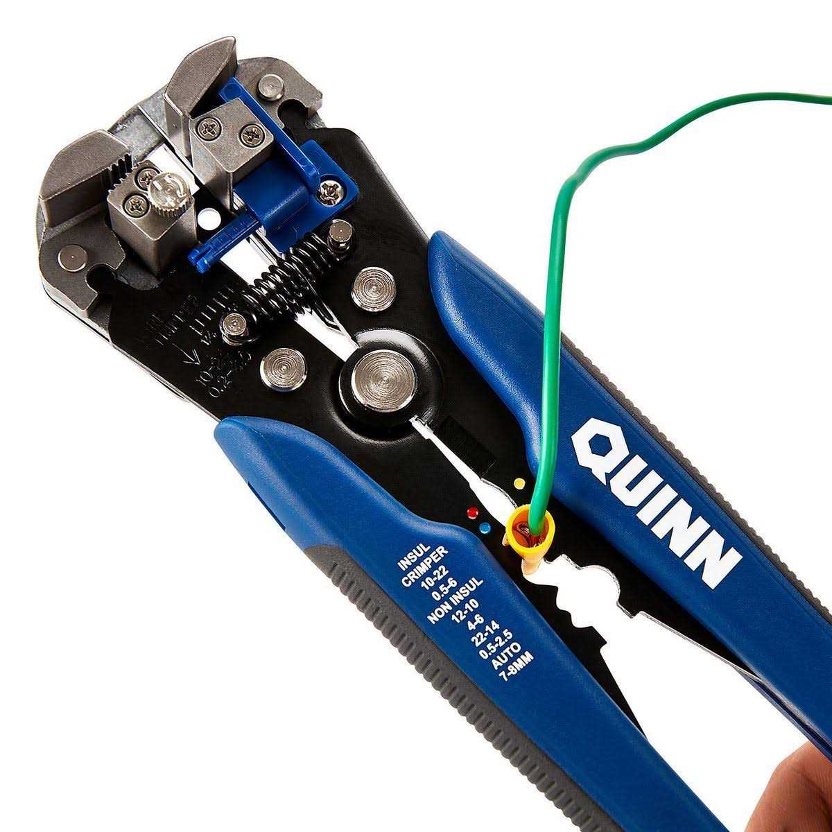 The QUINN self-adjusting wire stripper speeds up jobs because it adjusts automatically to the correct wire gauge. This versatile wire stripper not only strips wire, it also cleanly cuts and crimps terminals. Constructed with high strength forged steel for long life, a comfortable TPR grip for nonslip usage and built-in cutter to cleanly cut and strip 10-24 AWG wire with ease.