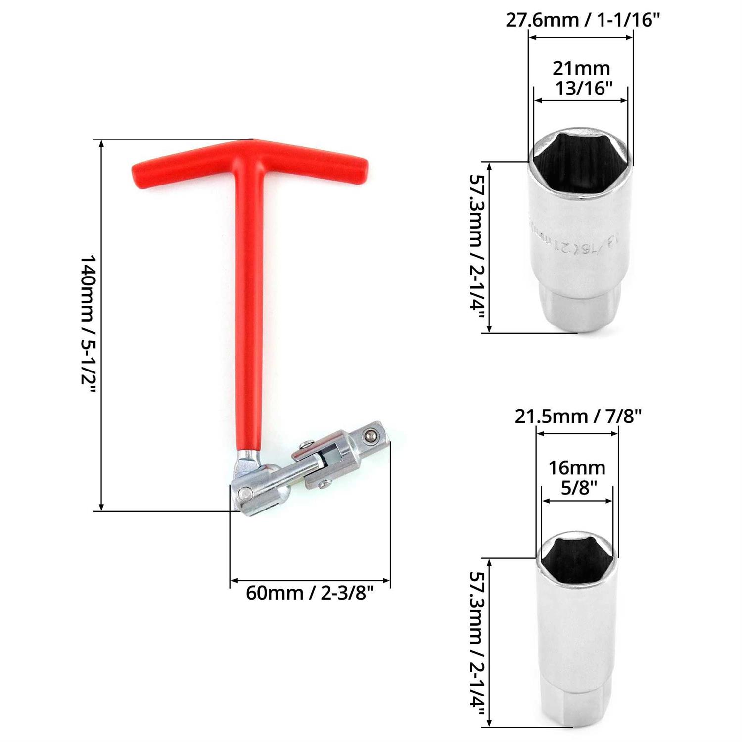 - Fit: Comes with two sockets, fit for 5/8 inch (16 mm) and 13/16 inch (21 mm) hex spark plugs.