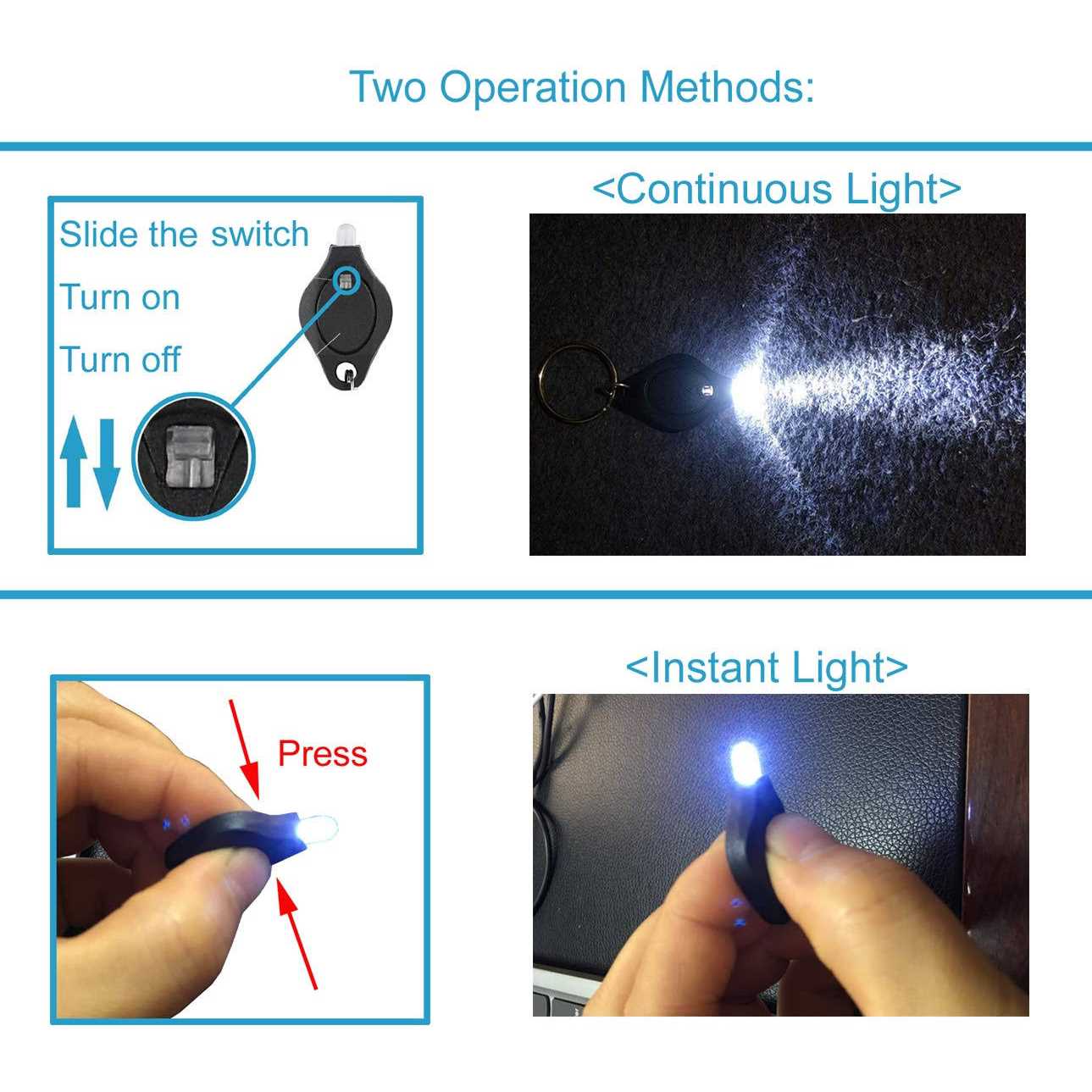 Ultra Bright LED Keychain Flashlight: The keychain LED flashlight offers 12 lumens handy close-up LED light, it can be the easiest nearby emergency light to get. Tiny and Lightweight and Safe LED Keychain Light: The size of the keychain LED flashlight is like a quarter, It’s only 0.25OZ weight. It’s very convenient to attach to the keychain, dog collar, zipper, backpack, hiking or camping devices and so on. It’s very convenient for you to carry with it everywhere, have the keychain light, have the safety with you. Two Easy Use Methods: (1)Instant Key Light: Slightly pinch the middle of the keychain flashlights with your two fingers to activate instant light; (2)Continuous Light: Slide the On/Off Switch to turn on or turn off the mini LED keychain flashlight. Replaceable CR2016 Batteries: The mini keychain flashlight is installed 2 x CR2016 batteries, usually it gives you up to 12 hours of continuous use. When the power of the batteries are running out, you can replace the CR2016 batteries yourself. Great Gifts for Lighting Effect: They are also perfect for night party, Christmas, Halloween¡ Features: /B BR 1 Ultra Bright LED Keychain Flashlight: The keychain LED flashlight offers 12 lumens handy close-up LED light, it can be the easiest nearby emergency light to get. BR 2 Tiny and Lightweight and Safe LED Keychain Light: The size of the keychain LED flashlight is like a quarter, It’s only 0.25OZ weight. It’s very convenient to attach to the keychain, dog collar, zipper, backpack, hiking or camping devices and so on. It’s very convenient for you to carry with it everywhere, have the keychain light, have the safety with you. BR 3 Two Easy Use Methods: (A)Instant Key Light: Slightly pinch the middle of the keychain flashlights with your two fingers to activate instant light; (B)Continuous Light: Slide the On/Off Switch to turn on or turn off the mini LED keychain flashlight. BR 4 Replaceable CR2016 Batteries: The mini keychain flashlight is installed 2 x CR2016 batteries, usually it gives you up to 12 hours of continuous use. When the power of the batteries are running out, you can replace the CR2016 batteries yourself. BR 5 Great Gifts for Lighting Effect: 6 PCS key ring flashlight are included in the package. They are also perfect for night party, Christmas, Halloween, and outdoor activities. BR BR Specification : /B BR Light Source Type: LED BR Light Color: Cool White BR Output Luminous: Flux 12 lumens BR Mode: 1 Mode/Single Mode, (On/Off) BR Battery Configuration: 2 X CR2016 Batteries (batteries are included) BR Flashlight Shell Color: Black BR Size(Length*Width*Height): 1.61″ x 0.91″ x 0.28″/4cm x 2.3cm x 0.7 cm BR Material: Hard Plastic BR Weight: 0.25OZ/7g BR BR Package include: /B BR 6 X Cool white light keychain flashlight-Black Shell BR 1 X User manual BR