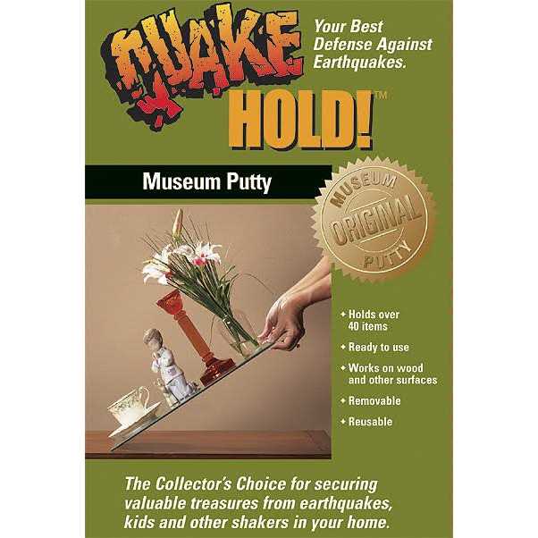 Removable, reusable and nontoxic putty secures antiques, collectibles and more from falling and breaking. Pull off amount needed, roll it in your fingers until soft, and apply to base of object. Lightly press object to surface. Remove by twisting and lifting from base. Comes off clean, works on most surfaces and walls. Will not damage furniture.