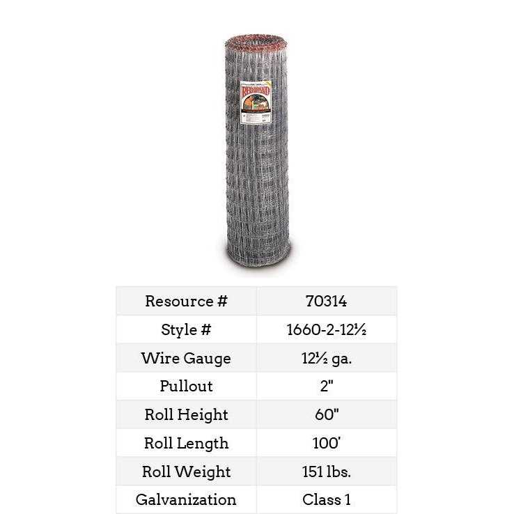 Red brand – 1660-2-12 1/2 – 60″ x 100′ – Non-climb horse fence – Red top line wire – Great fence for horses – 2″ x 4″ mesh design & varying heights prevent horses from stepping through – Walking down or getting over the fence – Woven fence which allows it to flex on impact preventing injury to horse or fence – When properly installed with the smooth side inward – Square deal knots won’t cut or damage horses – Woven & not welded so it helps resist being broken or eaten.