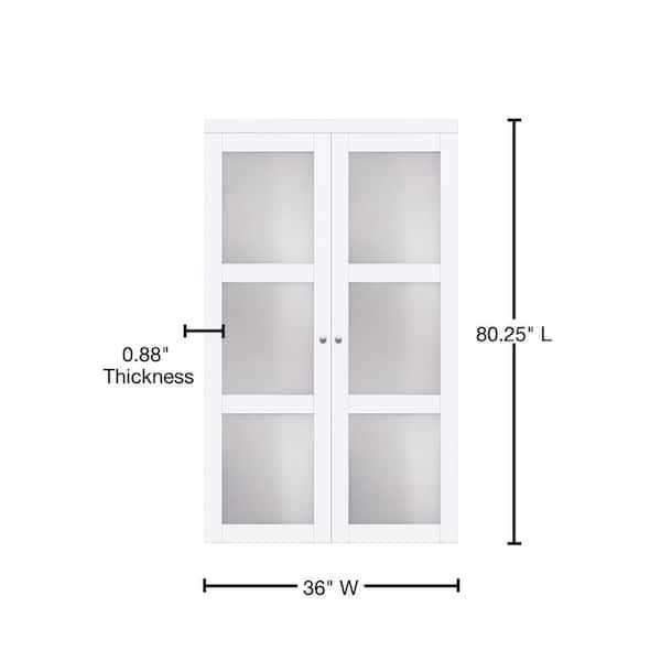 This European-inspired and Italian-designed, 3-lite pivot closet door with frosted glass insert highlights stylish heritage and elegance. The 3 frost glass inserts add a feeling of openness and light to your room, while concealing storage and preserving privacy. The hinge free design allows for more versatility in adjusting the door for out of square openings. Looking for a closet door idea to replace a traditional swing door, these doors allow full access without taking up the floor space of a swing door. Solid engineered wood framing features a scratch-resistant, smooth Off-White finish, framing three vertically stacked, translucent glass windows.